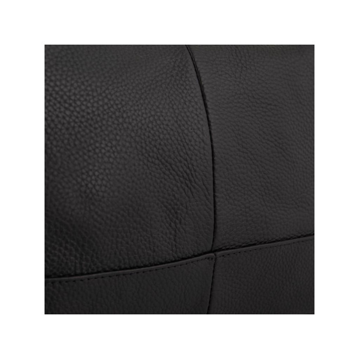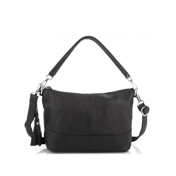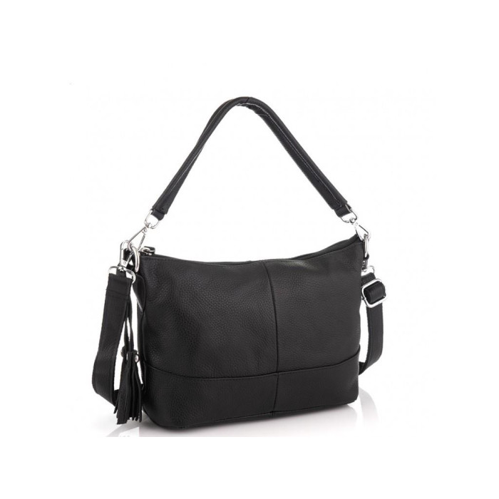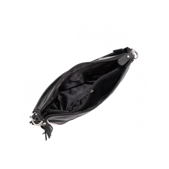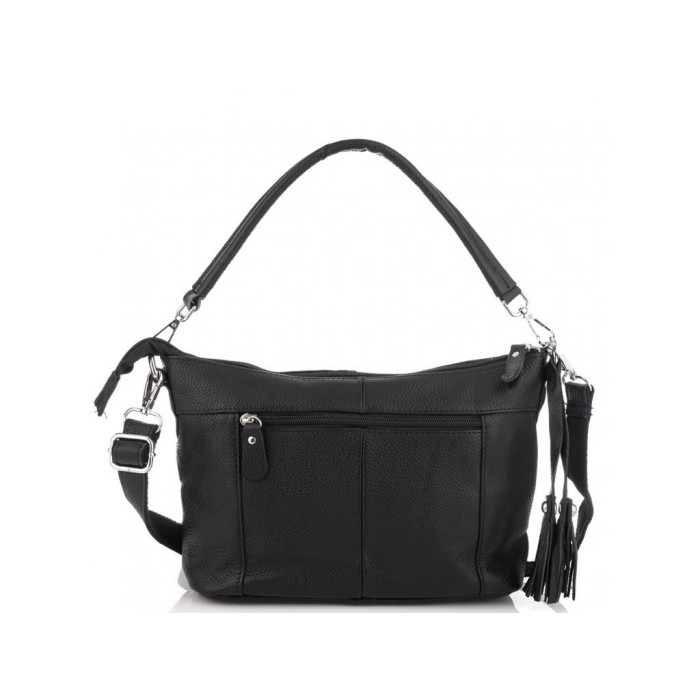 Аккуратная черная кожаная сумка с двумя ручками для переноски. Женская сумка имеет серебристую фурнитуру, черную приятную на ощупь подкладку внутри. Одно основное отделение содержит в себе два дополнительных кармана на молнии и карман открытого типа для мелочей. С тыльной стороны есть карман на молнии.