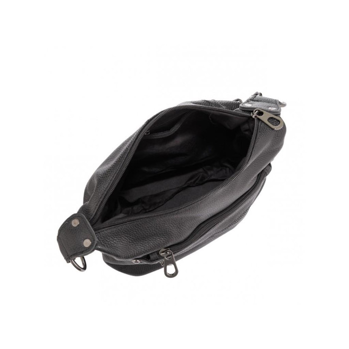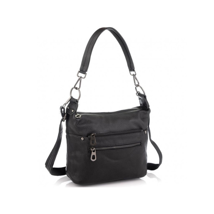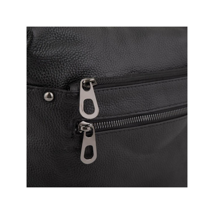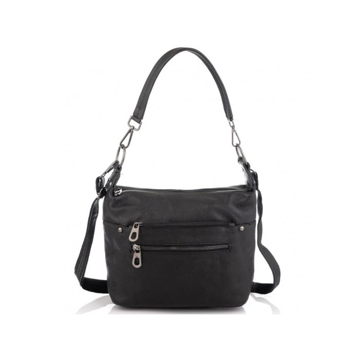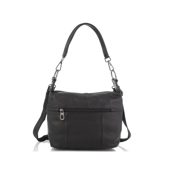 Для носки предусмотрен плечевой ремень и кожаная ручка 35 см. Фурнитура в сумки темно-серебряная. Сумка имеет одно основное отделение внутри которого есть два кармана на молнии и два маленьких кармана открытого типа для мелочей. С лицевой стороны два кармана на молнии, с тыльной стороны также карман на молнии.