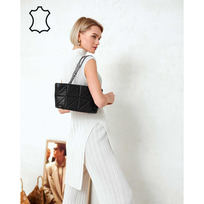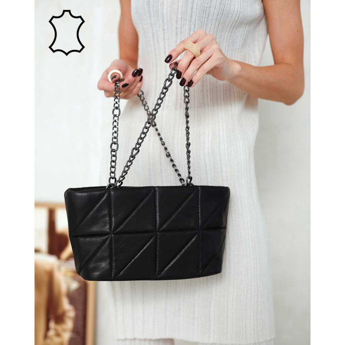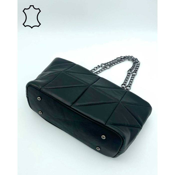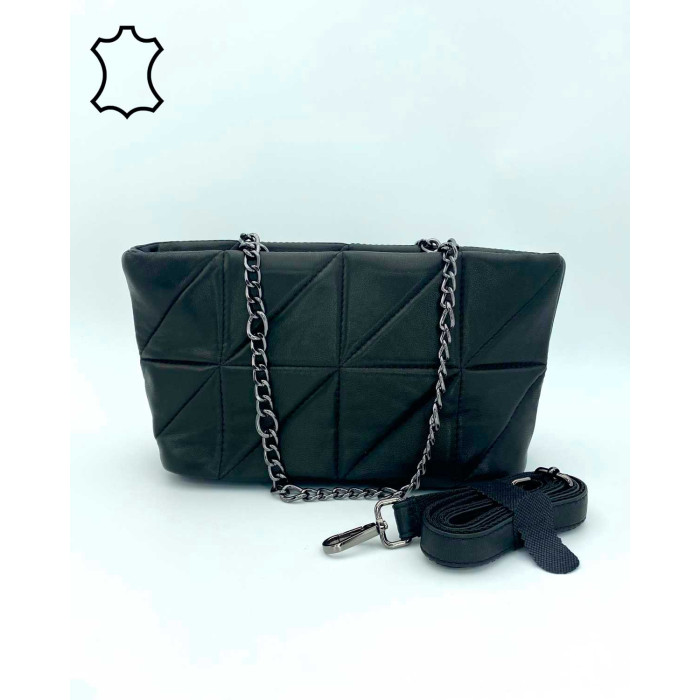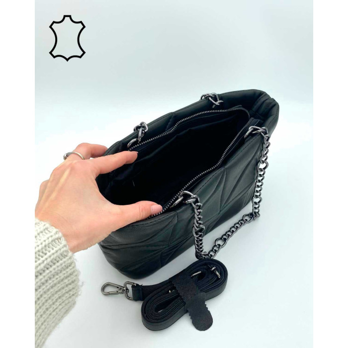 Кожаная стильная женская сумочка K6704 из натуральной овечьей кожи. Сумка открывается при помощи молнии. Внутри сумка на плотной подкладке, имеет два кармана: на молнии и открытый. Ручки сумки выполнены в виде цепочки.