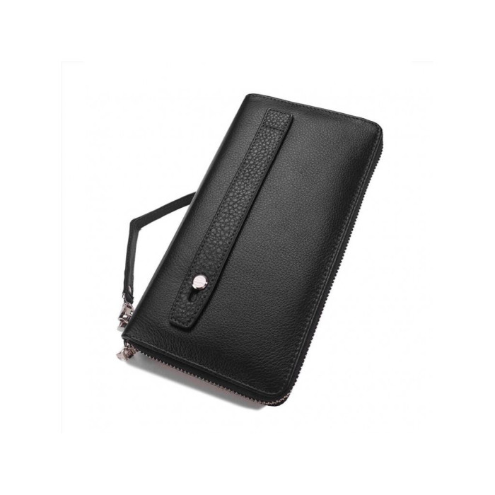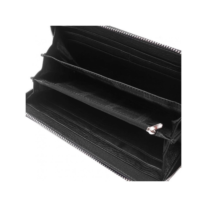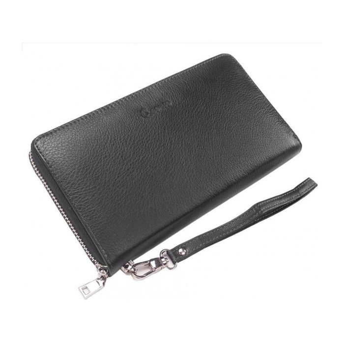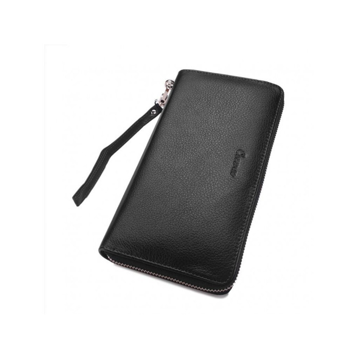 Клатч мужской в черном цвете на одно отделение. Для удобной переноски есть кожаная ручка с тыльной стороны и съемный ремешок. Внутри основного отделения три секции для купюр, карман-перегородка на молнии, восемь слотов для карт, а также два отделения открытого типа по бокам.