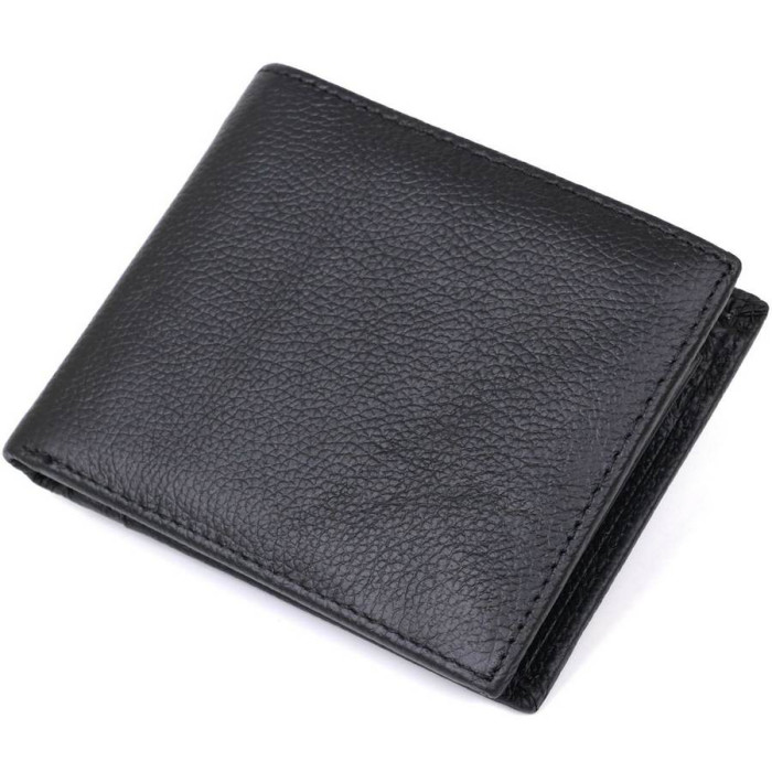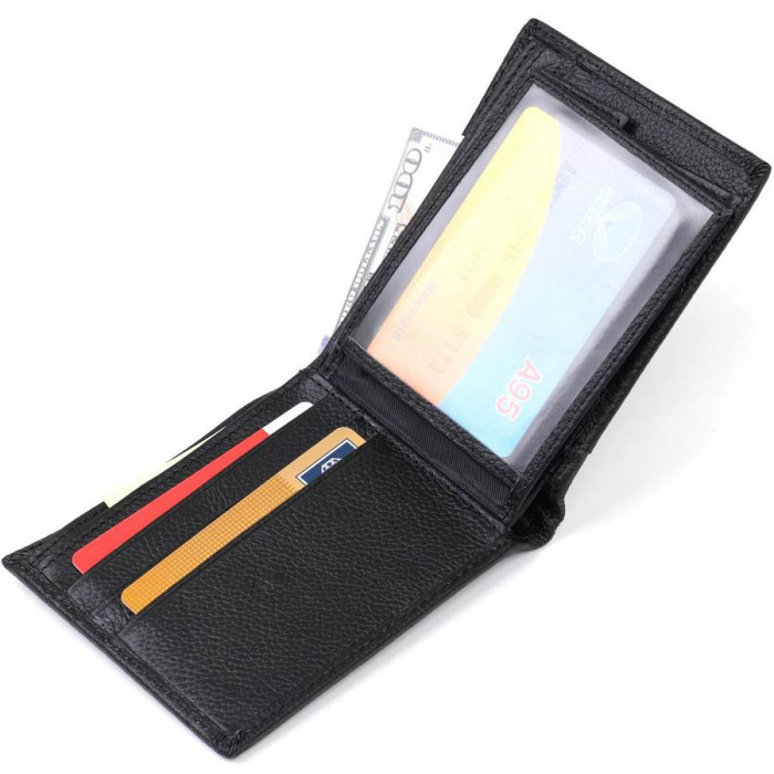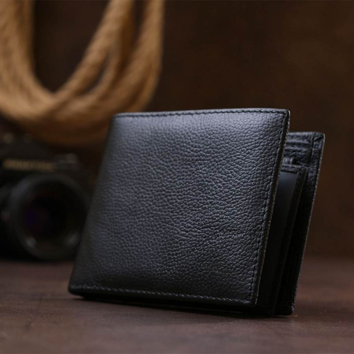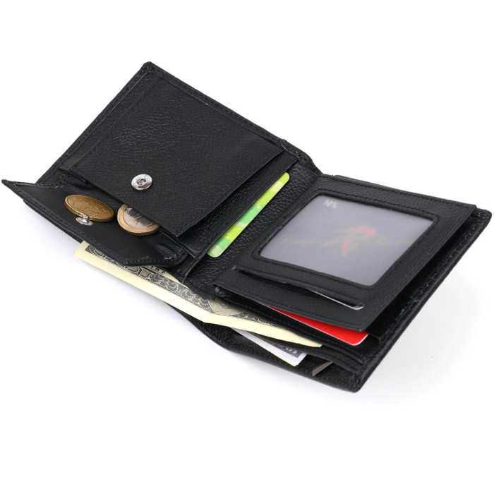Компактное мужское портмоне из натуральной высококлассной кожи с отменными характеристиками эксплуатации. Имеет вместительные отделения для купюр, слоты для кредитных и визитных карт, а также небольшую монетницу на кнопке. Такой кошелек легко поместится в сумке или кармане. Цвет изделия – черный, фактура – матовая.