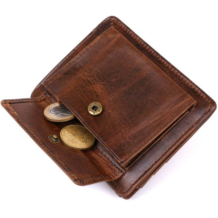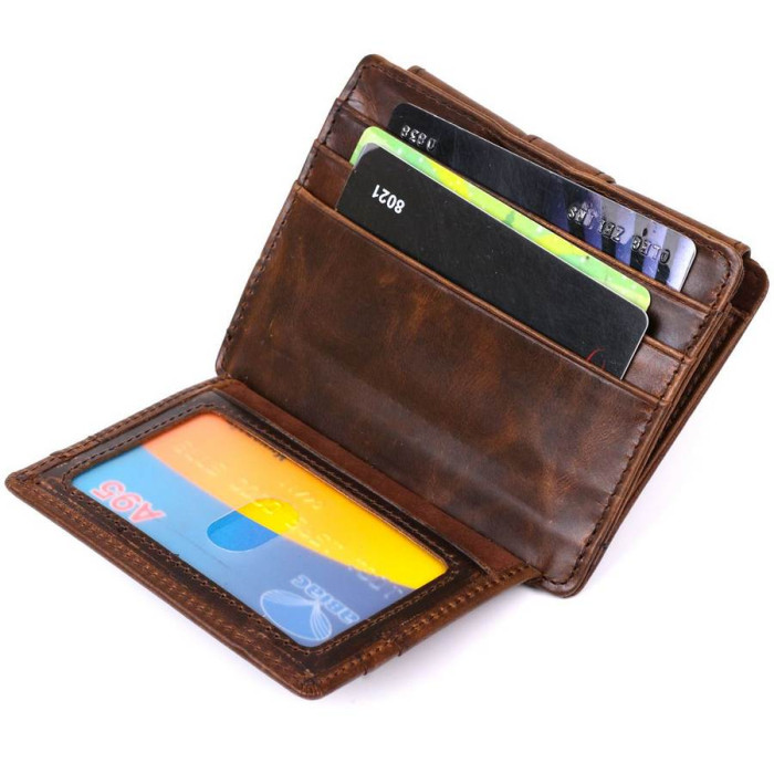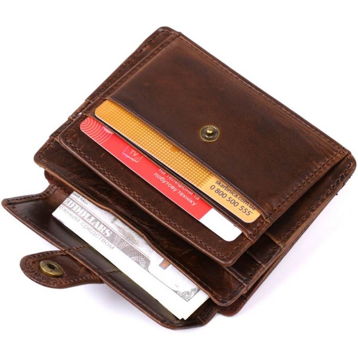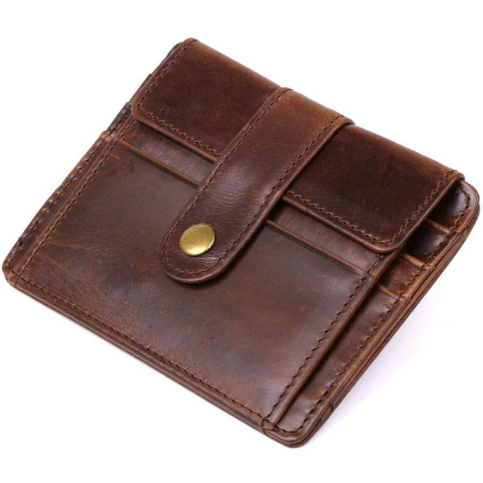 Оригинальный мужской кошелек небольшого размера из винтажной высококлассной кожи повышенной прочности. Имеет отделение для купюр, слоты для кредитных карточек, прозрачный кармашек и небольшую монетницу на кнопке. Такой кошелек занимает мало места, при это все необходимое будет всегда при Вас. Цвет изделия – коричневый, что смотрится очень красиво.
