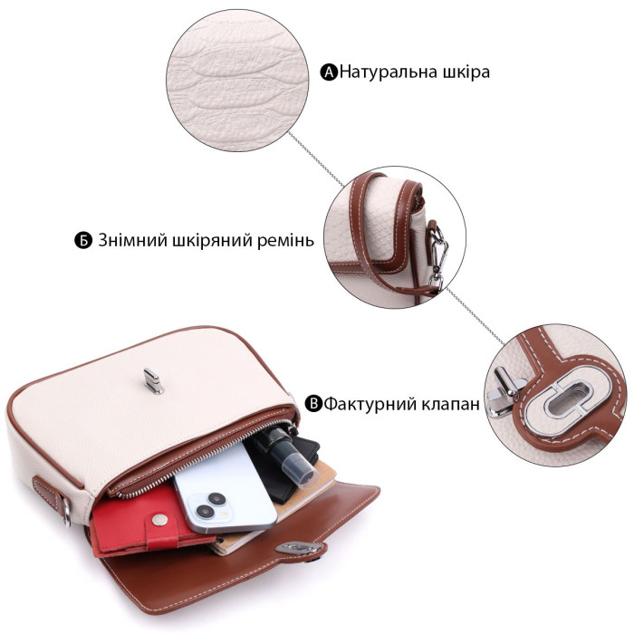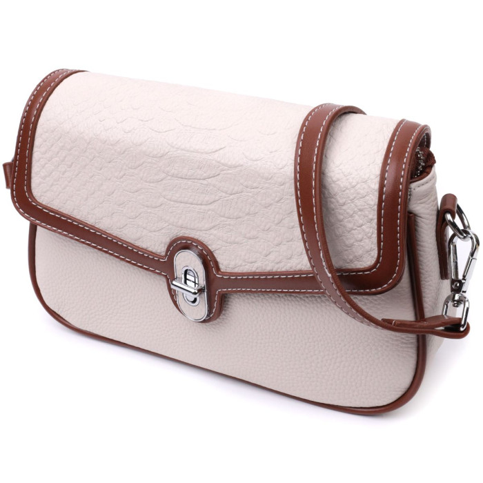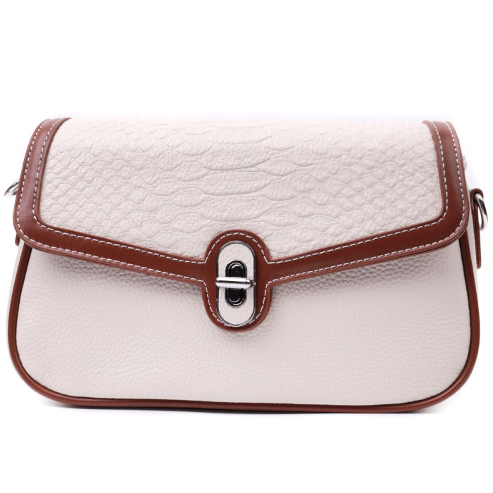 Красивая каркасная женская сумка из натуральной кожи. В изделии использована кожа белого и коричневого цвета. Притягивает взгляд в изделии фактурный клапан с тиснением под змею и изящная механическая защелка. Аксессуар состоит из основного отделения, кармана-перегородки на молнии, потайного кармана на молнии и кармана открытого типа, а также еще одного кармана снаружи, на тыльной стороне. Носить сумку можно в руке, под рукой, на плече и через плечо, для этого имеется кожаный съемный ремень. В аксессуаре использована качественная фурнитура цвета серебра. Универсальный вариант сумки на вечер, на каждий день, а также отлично будет сочетаться с деловым стилем.