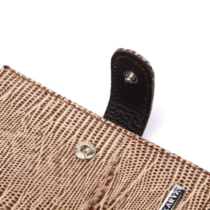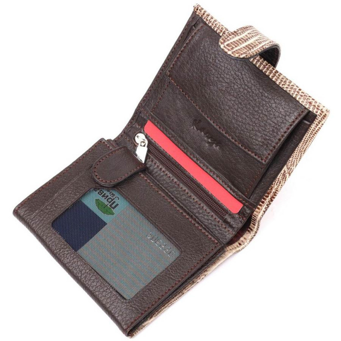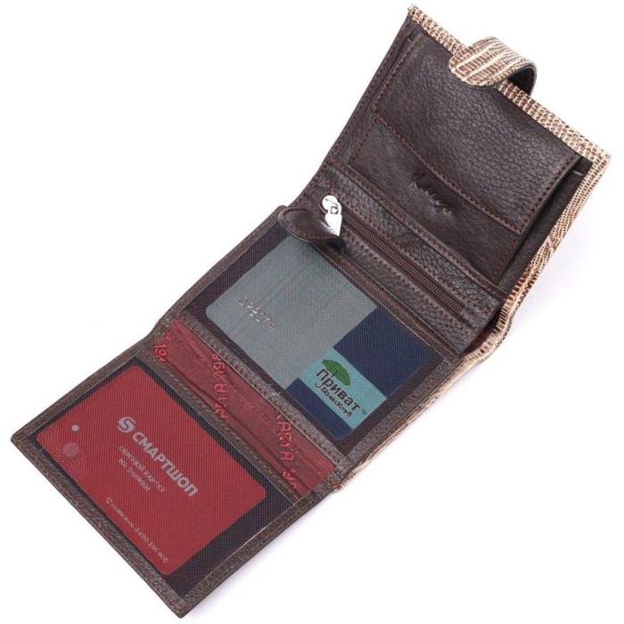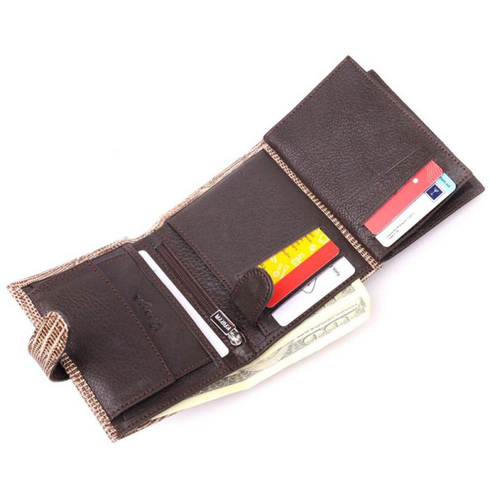 Небольшой мужской кошелек из качественной натуральной кожи в красивом бежевом цвете. Особенностью данного аксессуара есть наличие блока для кредитных карточек, что закрывается хлястиком на кнопку. Изделие закрывается на хлястик с кнопкой. На лицевой стороне в виде декора расположен металлический логотип производителя. Аксессуар упакован в фирменную коробочку. Изделия из натуральной кожи всегда будут отличным подарком для близкого человека.