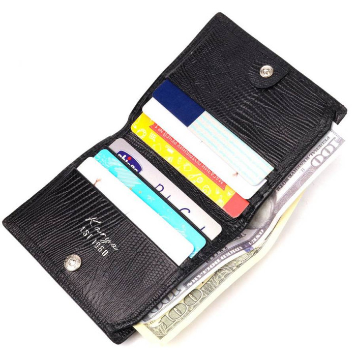 Компактный мужской кошелек из натуральной фактурной кожи, в черном цвете. Изделия закрывается на кнопку. Аксессуар упакован в фирменную коробочку. Изделия из натуральной кожи всегда будут отличным подарком для близкого человека.