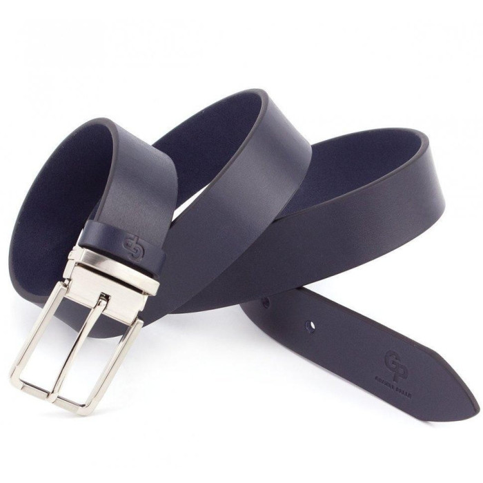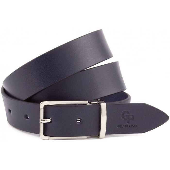 Темно-синий ремень из гладкой кожи Grande Pelle. Для создания данного ремня была использована качественная натуральная кожа итальянского производства. Кожаное полотно ремня оформлено темно-синим цветом. Срез кончика ремня острый, с фирменным тиснением бренда.