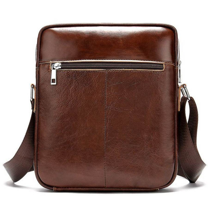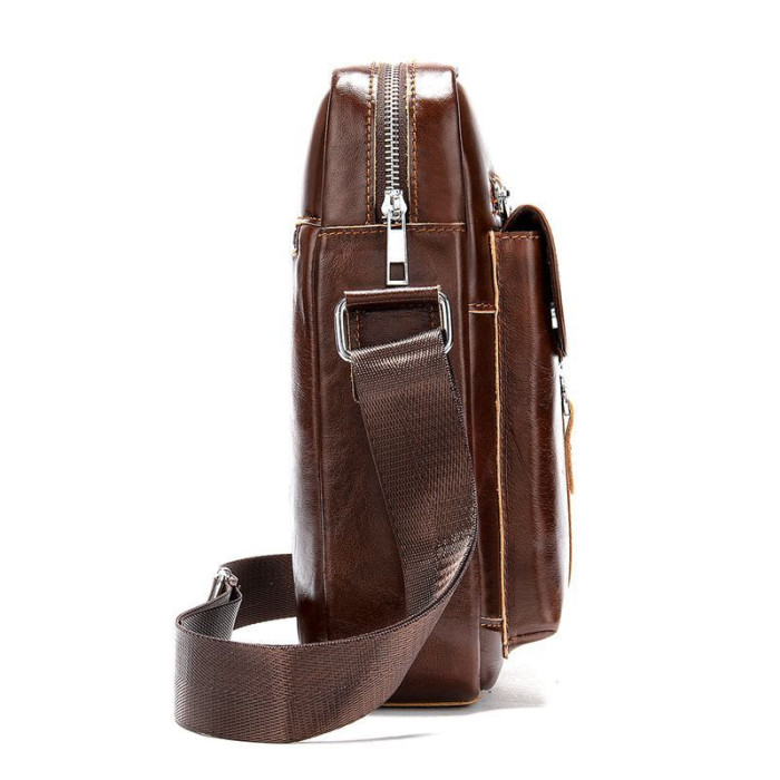 Сумка мессенджер B10-8516, из натуральной телячьей кожи, для мужчин. Изделие имеет одно основное отделение на молнии, внутри которого есть два кармашка под телефоны и один карман на молнии. Лицевая сторона аксессуара украшена большим накладным карманом с коротким клапаном, который застегивается на 2 магнитные кнопки и врезным карманом на молнии. Декорирована сумка серебристой фурнитурой. На задней стороне сумки имеется карман на молнии. Сумка носится через плечо на длинном регулируемом ремешке из текстиля.