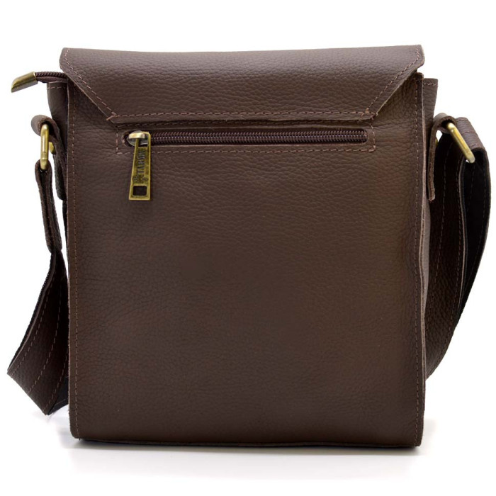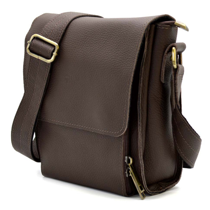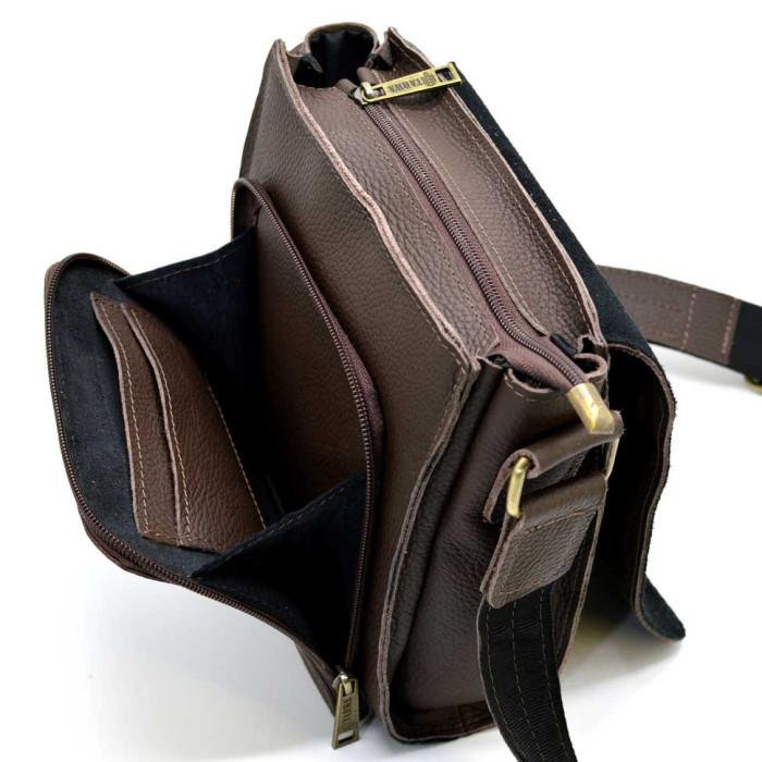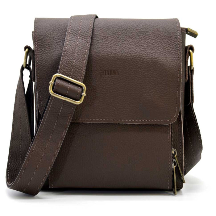 Мужская сумка через плечо кожаная FC-3027-3md от TARWA коричневый флотар. Сумка с кожаным клапаном, закрывается на два скрытых магнита. Кожаный прошитый ремень с регулировкой длинны в широком диапазоне.. Изделие состоит из одного отделения, внутри которого имеется карман на молнии для личных документов и еще один накладной открытый карман для телефона, например. Сумка застегивается на молнию и сверху накрывается клапаном с магнитной кнопкой. На клапане присутствует гравировка с логотипом производителя. Под клапаном располагается практичный, откидной, вместительный карман на молнии с внутренними кожаными отсеками, для пластиковых карт. На задней стороне изделия находится еще один карман на молнии. Сумка наделена кожаным, регулируемым ремнем.
