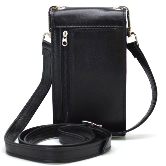 Сумка-чехол состоит с двух общих отделений, которые закрываются клапаном, внутри которых вшиты кармашки для банковских карт, с тыльной стороны присутствует врезной карман на молнии. В изделии используется качественная фурнитура, в серебряном цвете. Ремешок регулируется по длине.