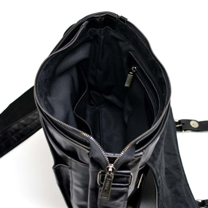 - Снаружи: на кожанам клапане карман на молнии, на задней стенке также карман на молнии, под клапаном два каскадных кармана на магнитных кнопках.