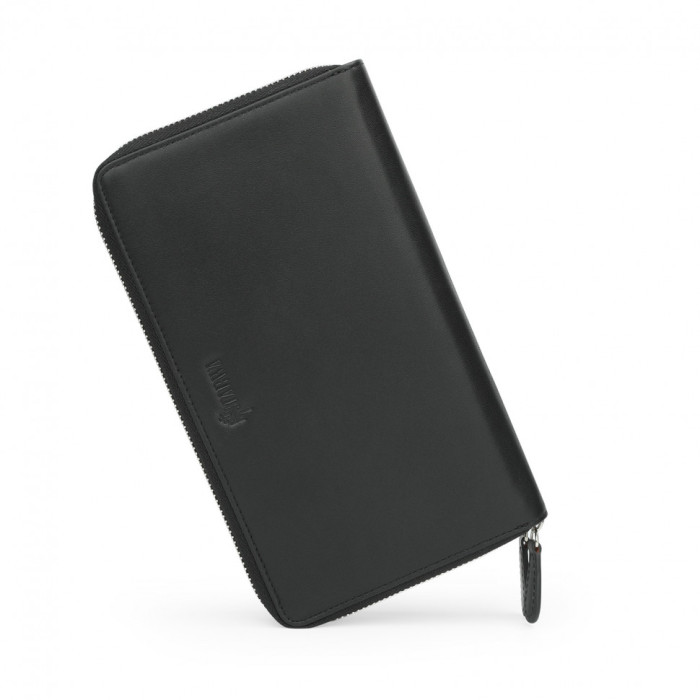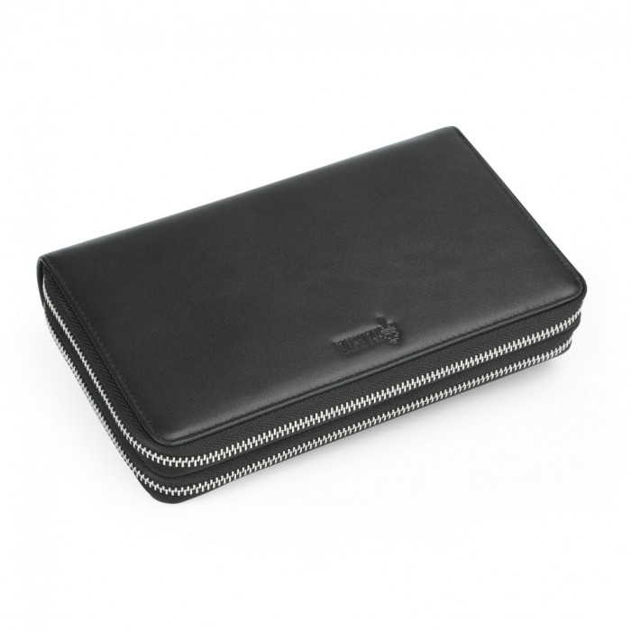 Клатч на два отделения изготовлен из натуральной лицевой кожи наппа в черном цвете.
