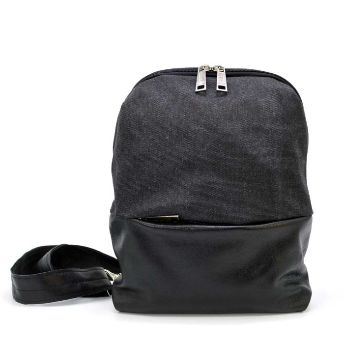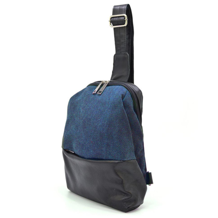 Мужской слинг через плечо, нагрудная сумка из кожи и канвас TARWA GAa-1905-3md. Шлейка перестегивается под левшу или правшу за 2 секунды путем перещелкивания карабина. Мягкая форма изделия, подстраивается под содержимое и ваши потребности. Интересное сочетание натуральной черной кожи наппа и канвас цвета глубокий синий.