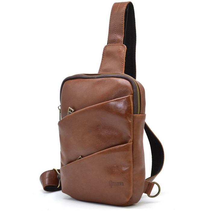 Сочетание классического прямоугольного профиля с косыми линиями передних карманов создают уникальный стильный лук с данным кожаным рюкзаком - слингом GB-0604-3md.