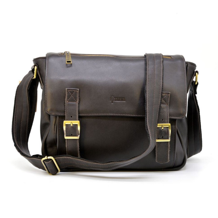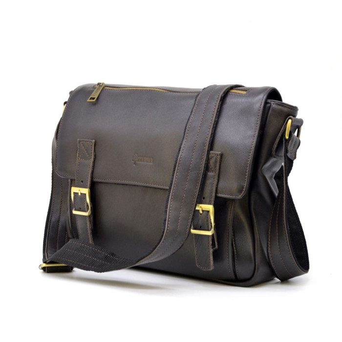 Мужская кожаная сумка через плечо из телячьей кожи коричневого цвета TARWA, GC-6045-3md с текстильным подкладом внутри (коричневого, черного или синего цвета - случайным образом). Внутри изделия один карман на молнии, три кармана поменьше для портмоне и телефона. Внутри сумка обшита износостойким натуральным текстилем. На лицевой стороне кожаный клапан на фальш-пряжках с магнитами и с карманом на молнии. На задней стенке сумки также имеется карман на молнии, под клапаном два каскадных кармана на магнитных кнопках. В комплекте: наплечный ремень с регулировкой длинны, может использоваться как мессенжер, наплечная сумка, повседневная сумка.