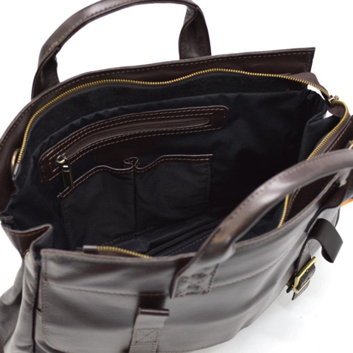 Изделие имеет одно основное отделение, внутри которого, есть большой кожаный карман, застегивающийся на липучку, для ноутбука 14" или документов. Также внутри сумочки есть два накладных маленьких кармана для телефонов, и один побольше, застегивающийся на молнию, например для ценных мелких вещей. На задней стороне сумки есть карман с молнией, а лицевую сторону украшают целых два крупных кармана, которые прикрыты наполовину кожаным клапаном с тонкими ремешками и магнитами. У данного аксессуара есть две маленькие кожаные ручки и съемный ремень через плечо, кожаный с текстильной основой, крепящийся с помощью металлических карабинов. Такая модель изготавливается и в множестве других цветов