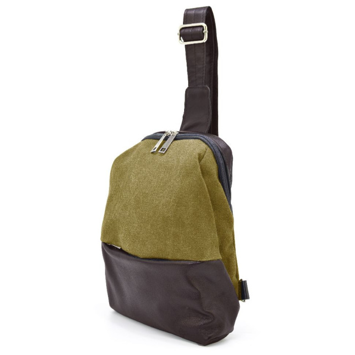 Рюкзак слинг на одно плечо из кожи и канвас TARWA GCh-1905-3md. Шлейка перестегивается под левшу или правшу за 2 секунды путем перещелкивания карабина. Мягкая форма изделия, подстраивается под содержимое и ваши потребности. Интересное сочетание натуральной коричневой кожи наппа и канвас цвета хакки