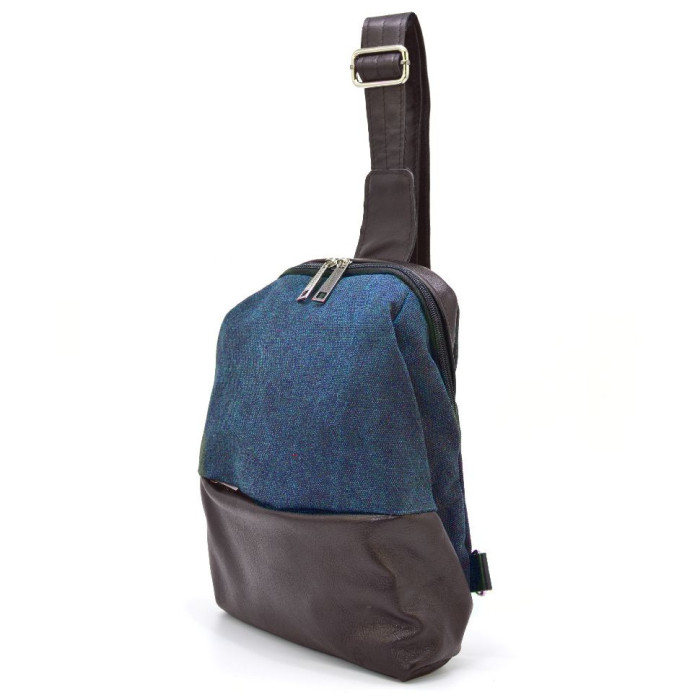 Рюкзак слинг на одно плечо из кожи и канвас TARWA GCk-1905-3md. Шлейка перестегивается под левшу или правшу за 2 секунды путем перещелкивания карабина. Мягкая форма изделия, подстраивается под содержимое и ваши потребности. Интересное сочетание натуральной коричневой кожи наппа и канвас цвета насыщенный синий