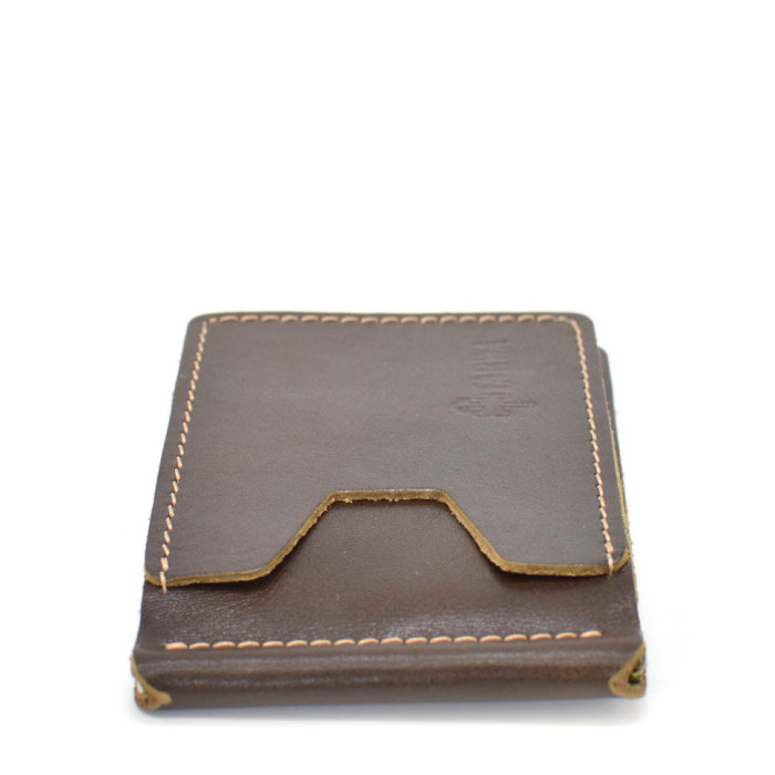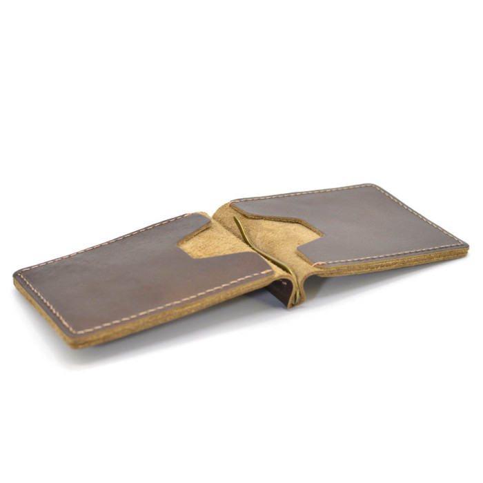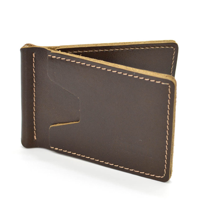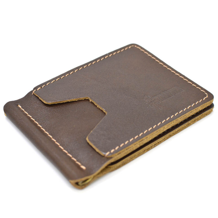 Кожаный зажим для денег мягкий коричневый GQw-hold-001 TARWA. Аксессуар изготовлен из натуральной кожи наппа коричневого цвета, ручной работы со светлой строчкой (ниткой). Четыре слота под банковские карты (два внутри, два снаружи), крюк на пружине для фиксации купюр. Толстая и прочная нить. У данной модели зажима TARWA внутри есть крюк-зажим для купюр и 4 отделения для карт. Размер зажима позволяет легко поместиться в карман. Размер 11.5 см на 8 см.