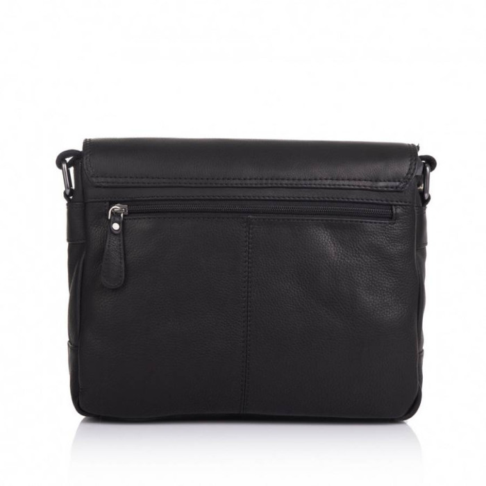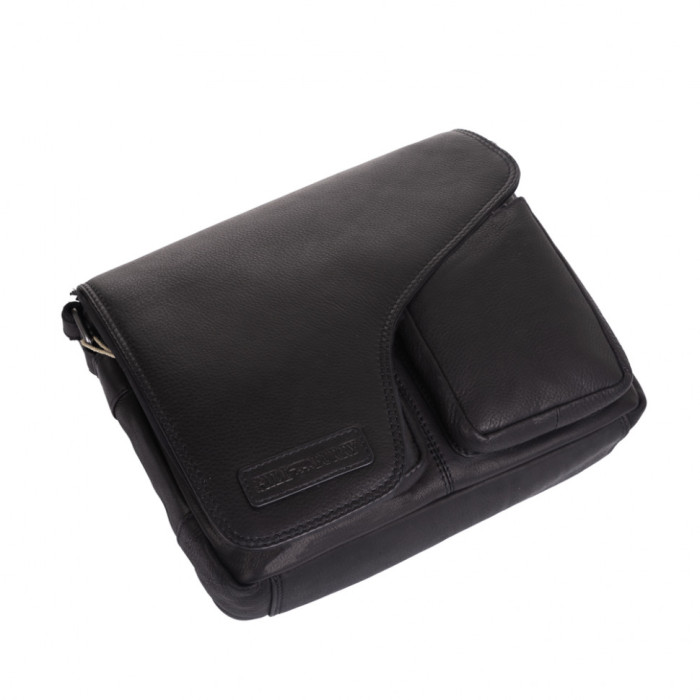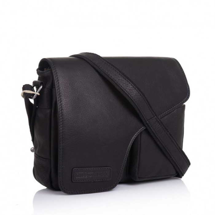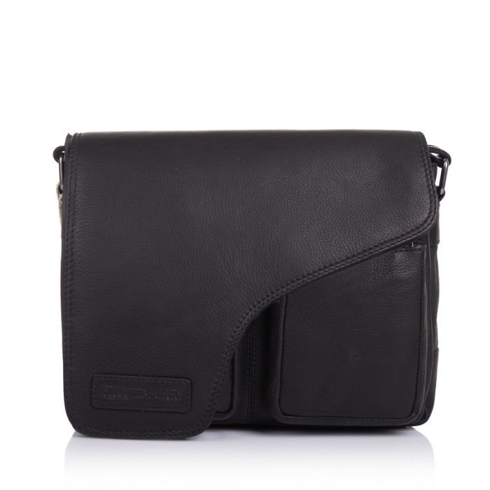 Мужская кожаная сумка через плечо в черной телячьей коже от Немецкого бренда Hill Burry с фигурным клапаном и передними накладными карманами. Внутри качественная дорогая текстильная подкладка с фирменным рисунком