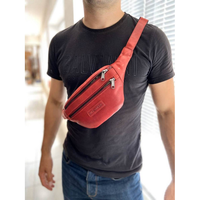Поясная сумка кожаная мужская или женская красная Hill Burry HB3314. Два отделения на молниях. Задний карман на молнии. Внутри тканевая подкладка. Ремень регулируемый, на двух карабинах.. Внутри тканевая подкладка. Ремень регулируемый