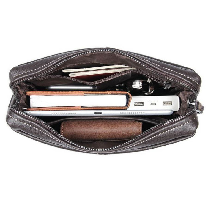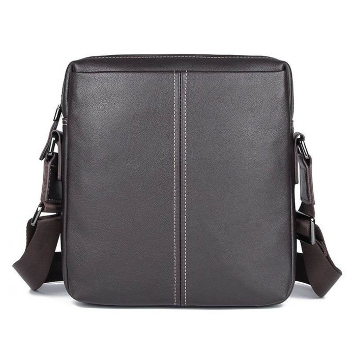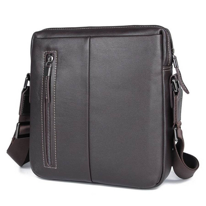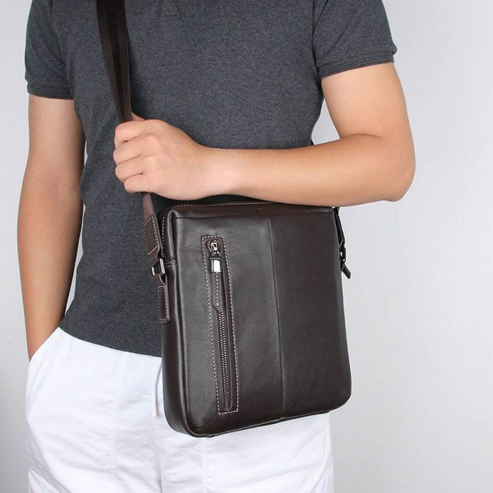 Мужская сумка через плечо JD1047Q, из натуральной телячьей кожи коричневого цвета, от бренда John McDee. Модель может вмещать формат А5. Изделие состоит из одного отделения, которое застегивается на молнию, с двумя карманами внутри: один врезной с молнией, и открытый, для смартфона или портмоне. Лицевую сторону дополняет вертикальная молния/карман, а также второй карман - плоский, занимает почти на всю поверхность сумки, на магнитной кнопке. Аксессуар наделен плечевым текстильным ремешком на плечо, с регулировкой длины.
