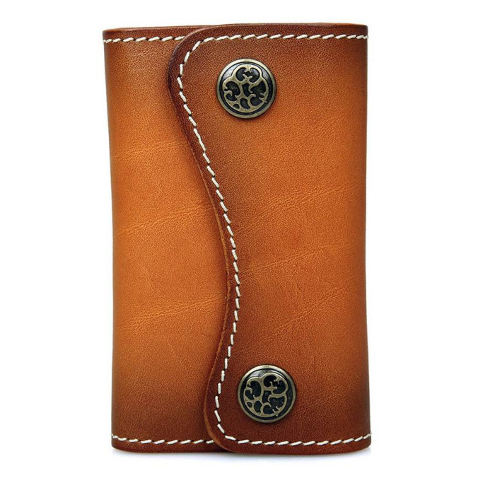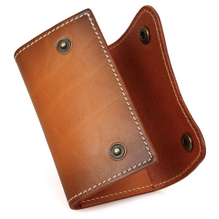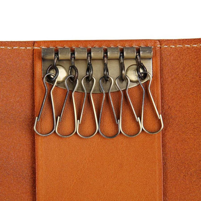 Ключница темно-коричневая с белой строчкой JD8130Q-1 John McDee. Аксессуар с дизайном под старину для надежного хранения и ношения ключей. Ключница выполнена из натуральной телячьей кожи, на двух декоративных кнопках и изогнутой линией клапана. Внутри изделия размещены 6 крючков для ключей. Благодаря небольшому размеру, можно носить ее в кармане джинсов или в кармане сумки. Фурнитура латунь.