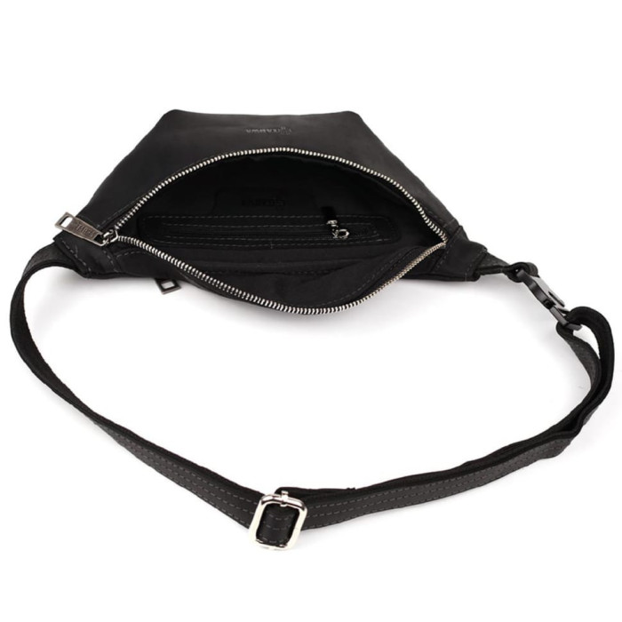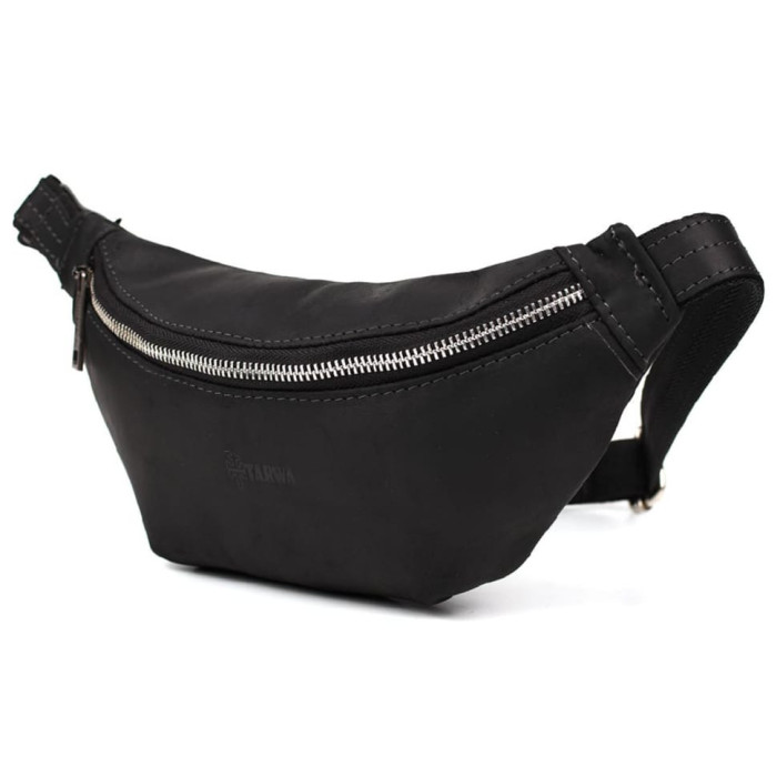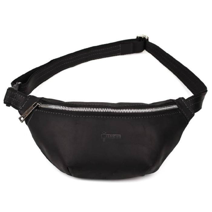 Стильная поясная сумка черного цвета TARWA RA-7416-4lx Сумка бананка снова в моде! И это не удивительно, ведь она очень компактная и простая в использовании. Ее можно носить на поясе или через плечо по диагонали. Основное отделение закрывается на молнию, внутри есть большой карман, например, для смартфона. И еще остается место для портмоне, наушников и очков. На обороте предусмотрен карман на молнии. Материалом служит качественная говяжья кожа.