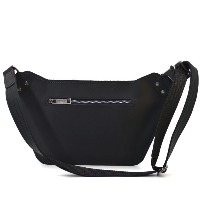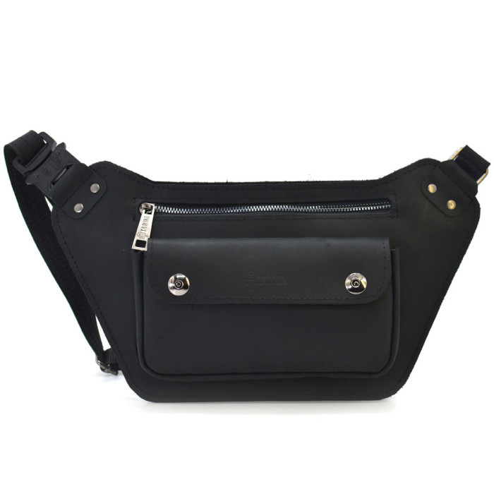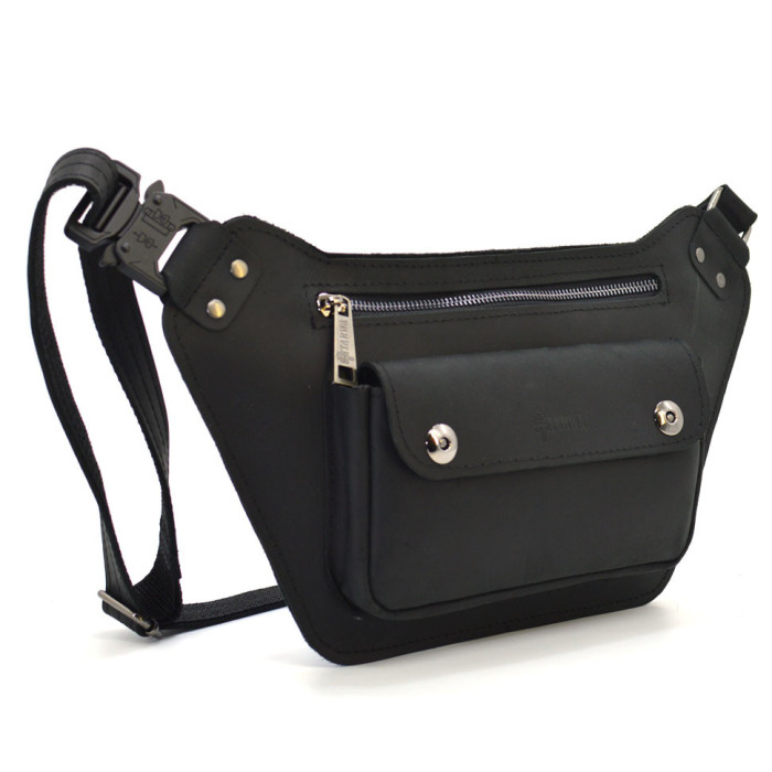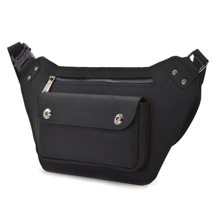 Кожаная бананка напоясная черная лошадиная кожа RA-8133-3md TARWA. Ваши документы, деньги и телефоны под рукой в любой ситуации. Застежка фастекс, быстросъемный, металлический. Стильный широкий клапан на переднем кармане с двумя кнопками "акулий глаз", тканевая подкладка внутри. Передний и задний отдел для вещей.