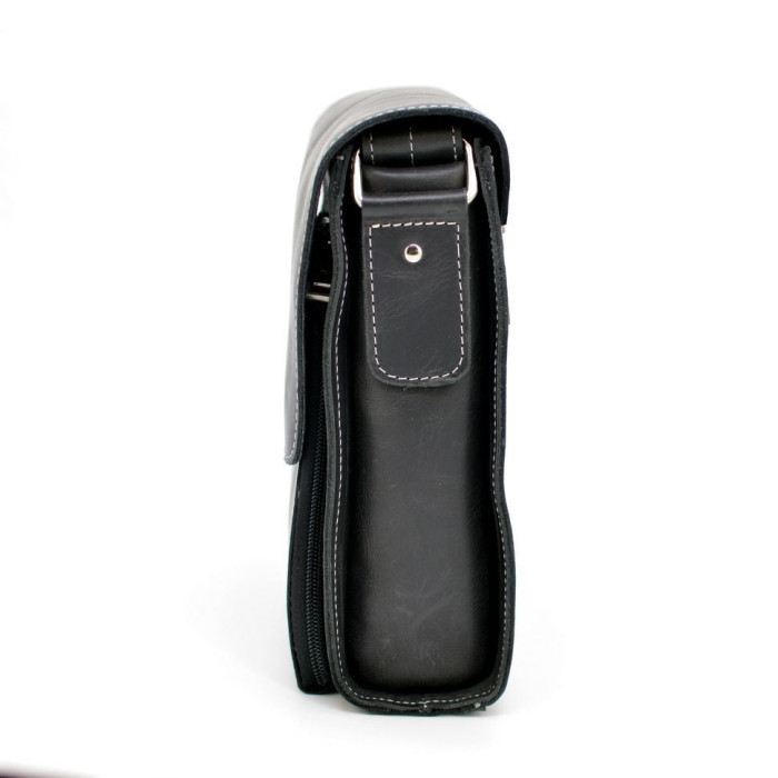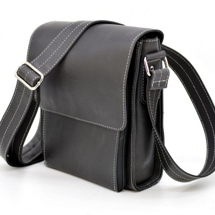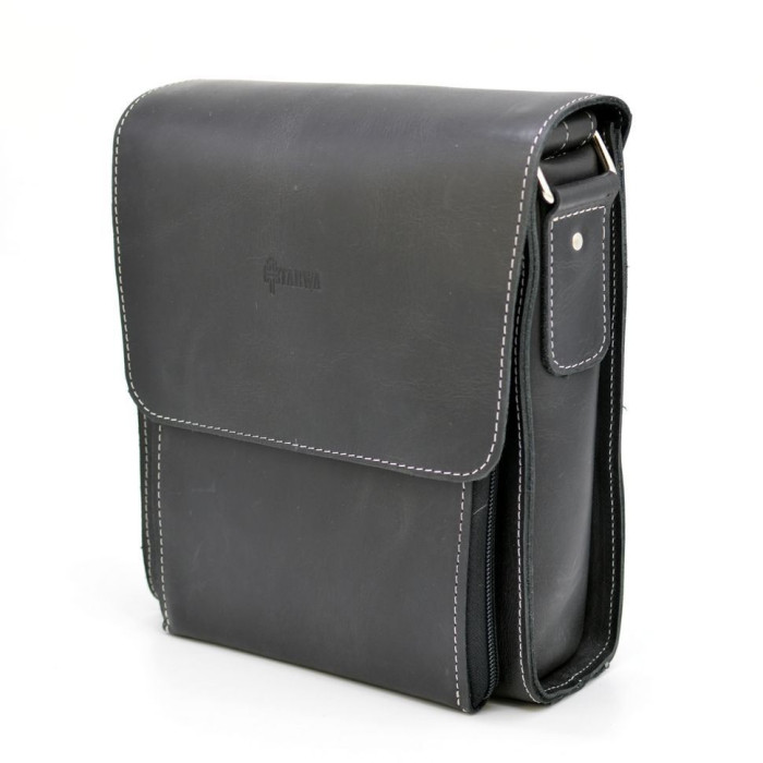 Сумка мужская из натуральной телячьей кожи черного цвета с белой контрастной строчкой RAw-3027-3md от украинского бренда TARWA. Изделие состоит из одного отделения, внутри которого есть карман на молнии для документов и еще один накладной открытый карман для телефона, например. Сумка застегивается на молнию и сверху накрывается клапаном с магнитной кнопкой. На клапане присутствует гравировка с логотипом бренда. На лицевой стороне, под клапаном располагается удобный откидной вместительный карман на молнии с внутренними кожаными отсеками для пластиковых карт или визиток. На задней стороне изделия находится еще один карман на молнии. Сумочка оснащена кожаным, регулирующимся по длине ремешком с текстильной основой, предохраняющей ремень от растяжения.