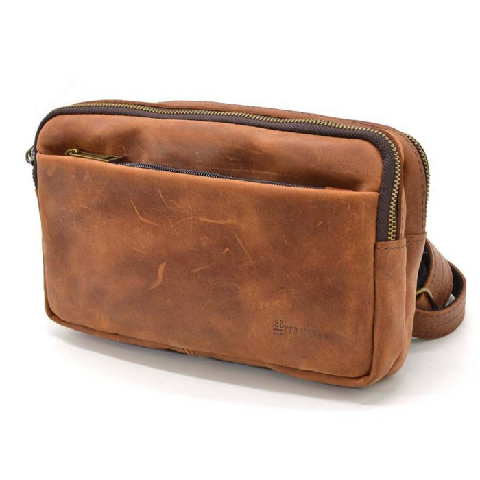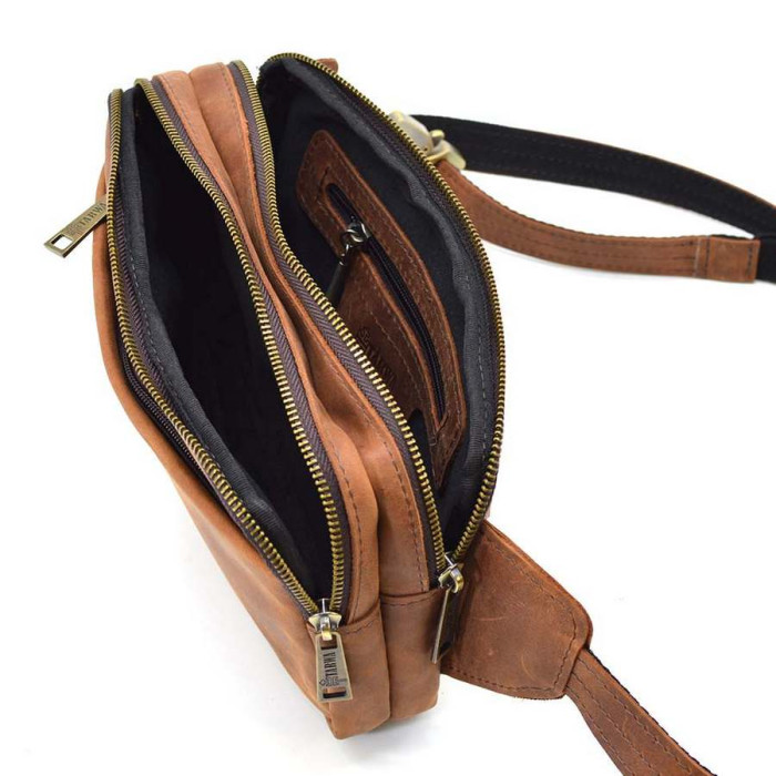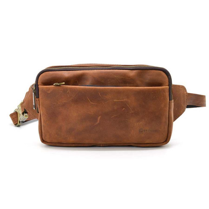 Напоясная сумка на два отделения TARWA RB-0704-3md коньячный крейзи лошадиная кожа (молния цвет - антик - стареное золото) с фастексом от украинского бренда TARWA. Качественный стильный аксессуар на каждый день в мегаполисе, поездке и на прогулке. Изготовлена из телячьей кожи высокого качества. Цвет - черный. Два раздельных больших отделения застегиваются на молнии с металлическими практичными застежками (пуллерами). Имеется внешний карман поменьше, также застегивающийся на молнию. С внутренней стороны есть карман для самых ценных вещей. Ремень полностью из кожи и текстильной основы. Застежка (фастекс) металлическая, быстросъёмная, применяется в военной амуниции, альпинизме. Текстильная прочная подкладка.