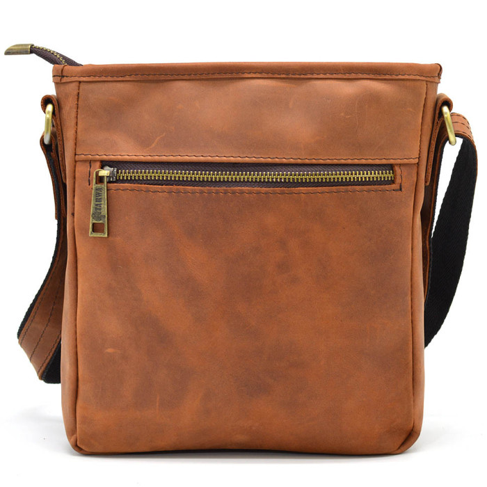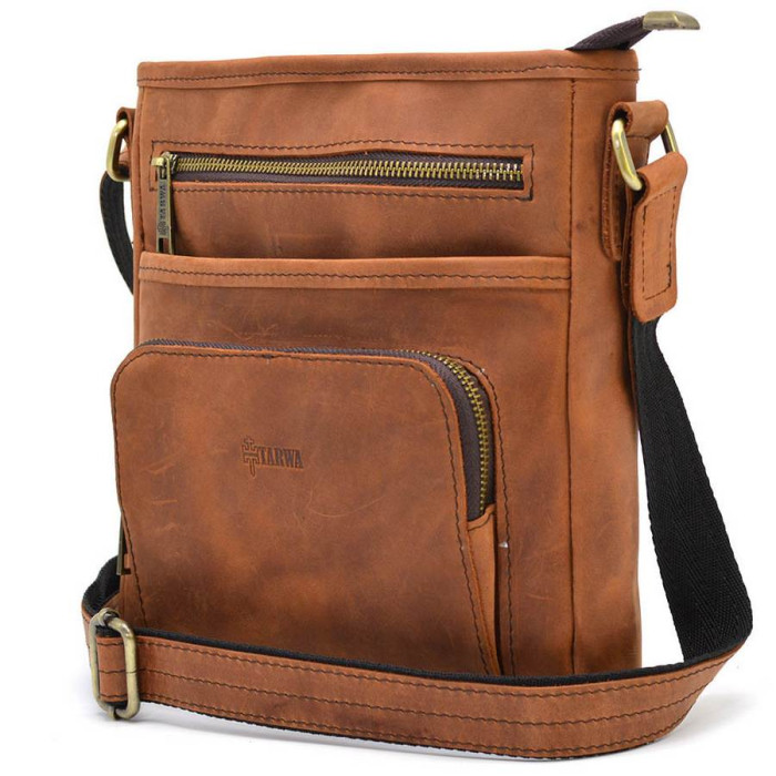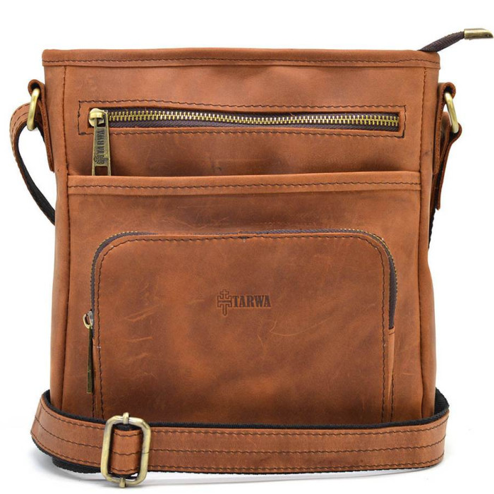 Мужская кожаная сумка мессенджер RB-1303-3md TARWA с карманом из лошадиной кожи крейзи хорс от украинского бренда TARWA. Изделие на одно отделение, которое застегивается на молнию. Может вмещать планшет. Внутри имеются карманы для мелких личных вещей: два открытых накладных и один врезной на молнии. На обоих наружных сторонах аксессуара располагаются врезные карманы на молнии. В изделии использован прочная тканевая подкладка. Сумочку можно носить на плече благодаря удобному регулирующемуся плечевому кожаному ремню. Молния - антик