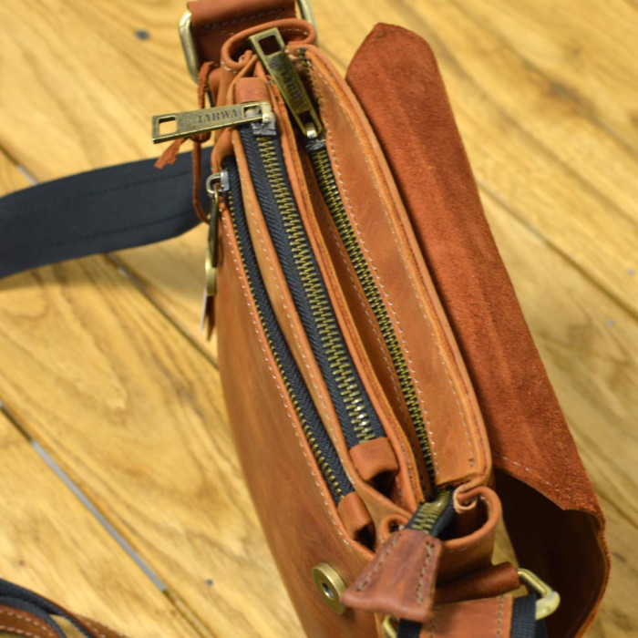 Сумка закрывается на клапан, который фиксируется магнитными кнопками. У сумки под клапаном одно основное отделение на молнии и два кармана под клапаном тоже на молниях. На тыльной стороне - карман на молнии. Суммарно, сумска имеет 4 кармана на молнии и внутренние открытые карманы. Кожаный ремень комбинированный кожа + стропа. Вместо классической текстильной подкладки, внутри сумка продублирована кожаной подкладкой. Благодаря кожаной внутренней подкладки сумка на плечо TARWA RA-4129-4sa будет служить долго и будет менее подвержена износу. Металлическая фурнитура - практичный и долговечный выбор для сумки. Внутри открытый кожаный карман.