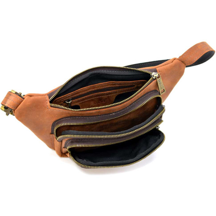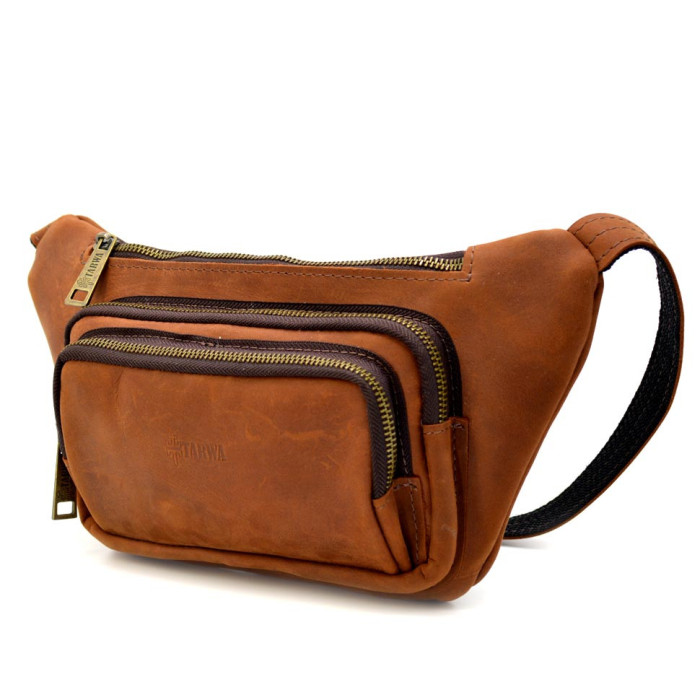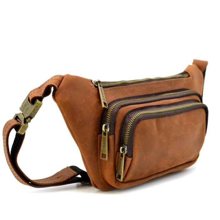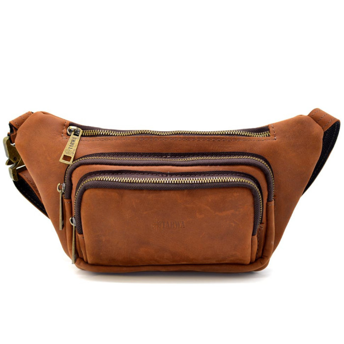 Кожаная бананка напоясная из лошадиной кожи светло-коричневая RB-8179-3md TARWA. Ваши документы, деньги и телефоны под рукой в любой ситуации. Рыжая плотная кожа крейзи хорс и фурнитура цвета антик. Четыре кармана на молнии на этой напоясной сумке, тканевой подклад внутри, тактический быстросъемный фастекс.