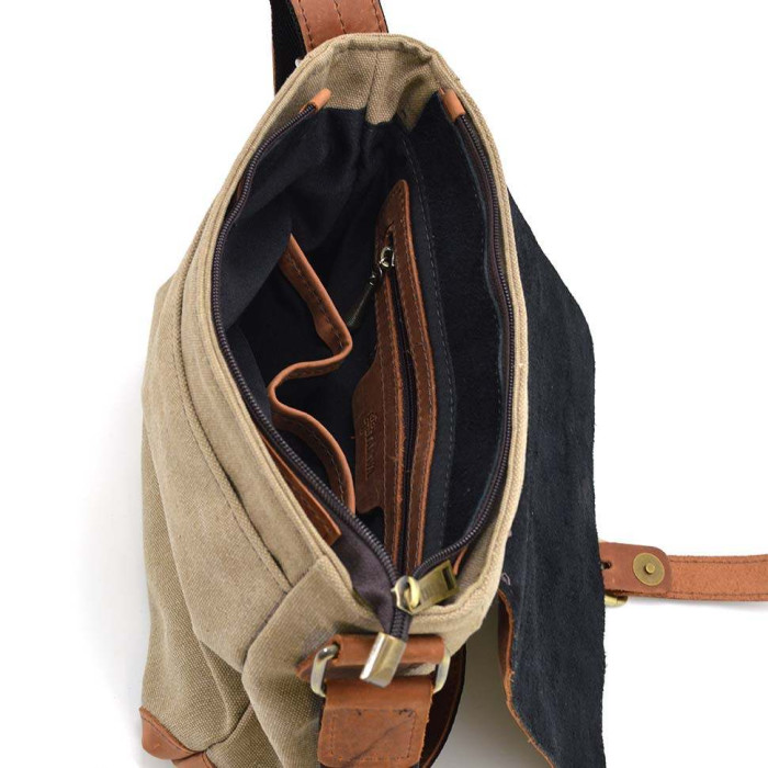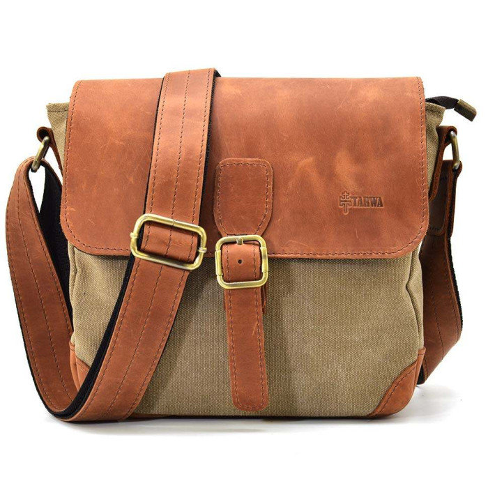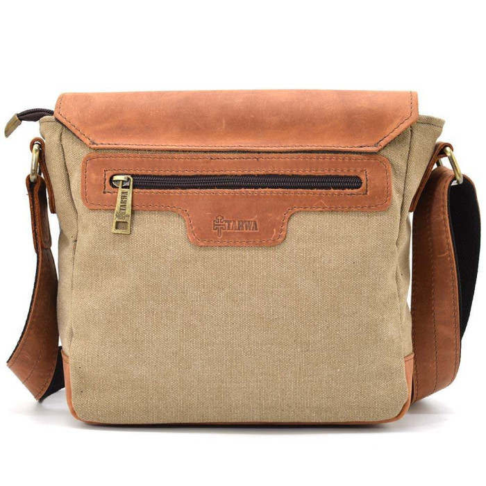 Сумка-месседжер от бренда TARWA выполнена в комбинации кожи и парусины. Незаменимый аксессуар на каждый день. Одно основное отделение, в котором: один карман на молнии и два кармана для мелких аксессуаров. Подкладка выполнена из плотной ткани. Качественная, прочная фурнитура с логотипом бренда в цвете антик.