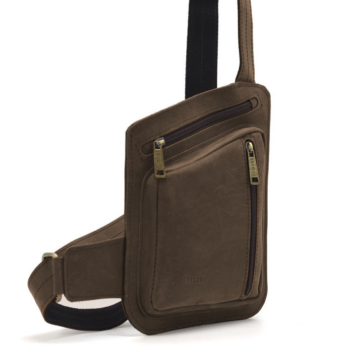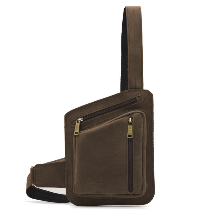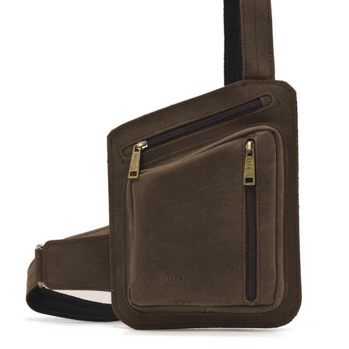 Кожаная нагрудная сумка, сумка-слинг из лошадиной кожи TARWA RC-235-3md в коричневом цвете. Открытый верхний карман без молнии для быстрого доступа под правую руку. Кожаный ремень с регулировкой длинны. Внутри текстильная подкладка.