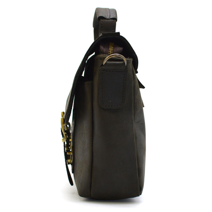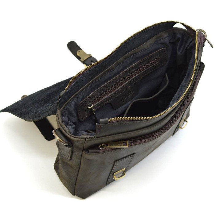 Внешняя часть сумки мессенждера сумки-портфели закрывается на кожаный клапан на металлических фальш-пряжках, под которыми два портфельных замка. На задней части сумки, отделение на молнии. Кожаный наплечный ремень регулируется, что позволяет подобрать удобное положение. Красивая фурнитура цвета бронзы.
