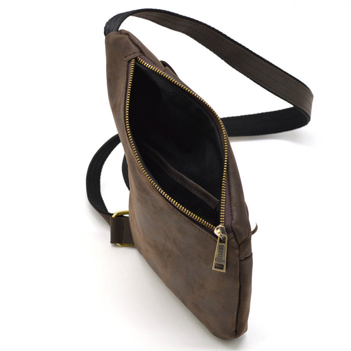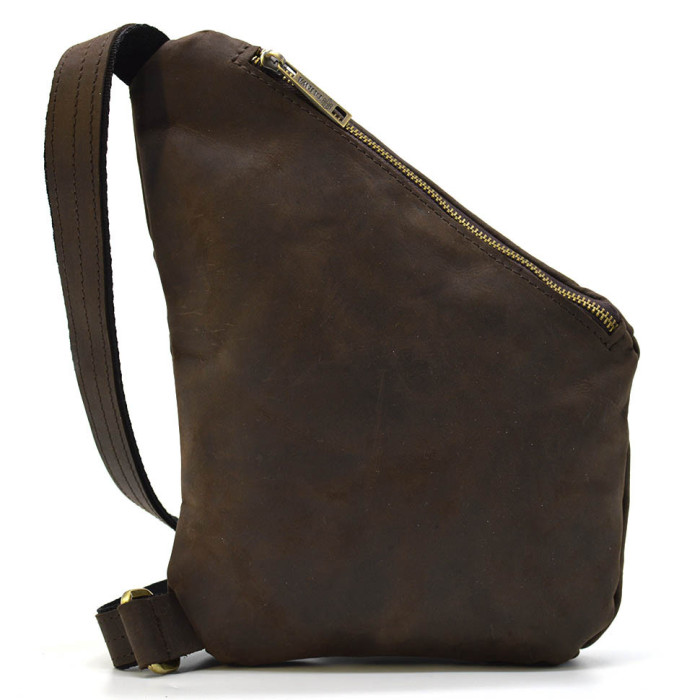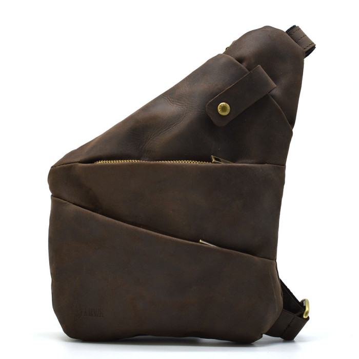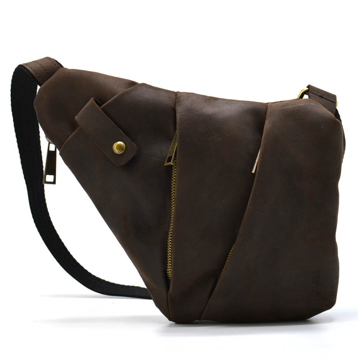 Мужская сумка-слинг через плечо TARWA RC-6402-3md крейзи хорс. Сумка-Косуха необычной трапецевидной формы, и с максимальной функциональностью при носке. Будет полезна в поездках и путешествиях. Нагрудная сумка 6402 из лошадиной кожи коричневого цвета выгодно подчеркнет ваш стиль. Сумка слинг практичная, долговечная и крайне удобная, регулировка ремня по длине, карман для телефона на магните, три кармана для вещей. Металлическая фурнитура, тканевая подкладка, внутри карман.