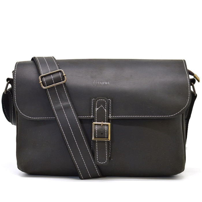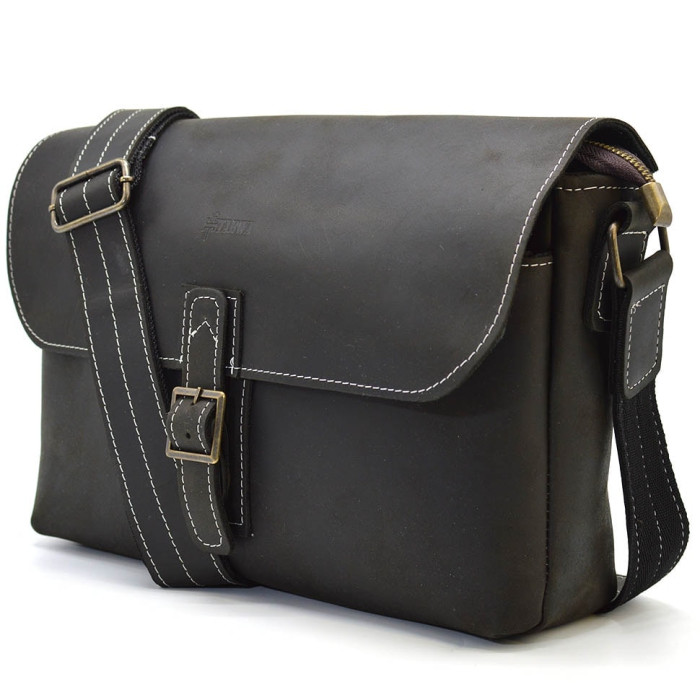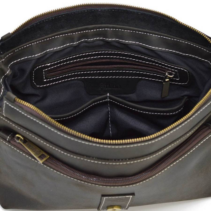 Стильная сумка мессенджер через плечо из лошадиной кожи унисекс от бренда TARWA RC-7084-3md. Качественная натуральная лошадиная кожа крейзи хорс. Захватывающий дизайн в темно-коричневом исполнении. Отлично подходит для ежедневного использования. Внешняя часть мессенждера закрывается на кожаный клапан на металлическом замке. На задней части сумки, отделение на молнии под небольшим клапаном. Кожаный наплечный ремень, который регулируется. Красивая фурнитура, цвет - бронза. Внутренняя часть сумки имеет в себе: