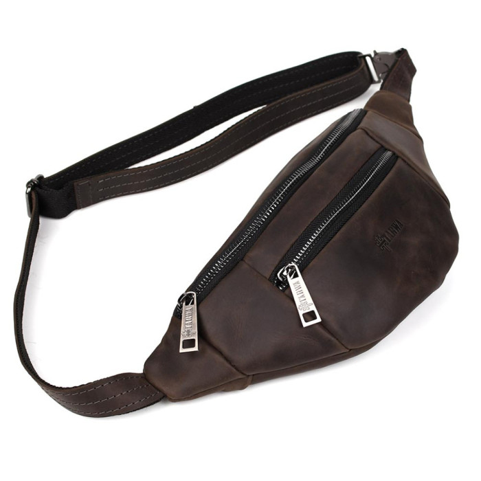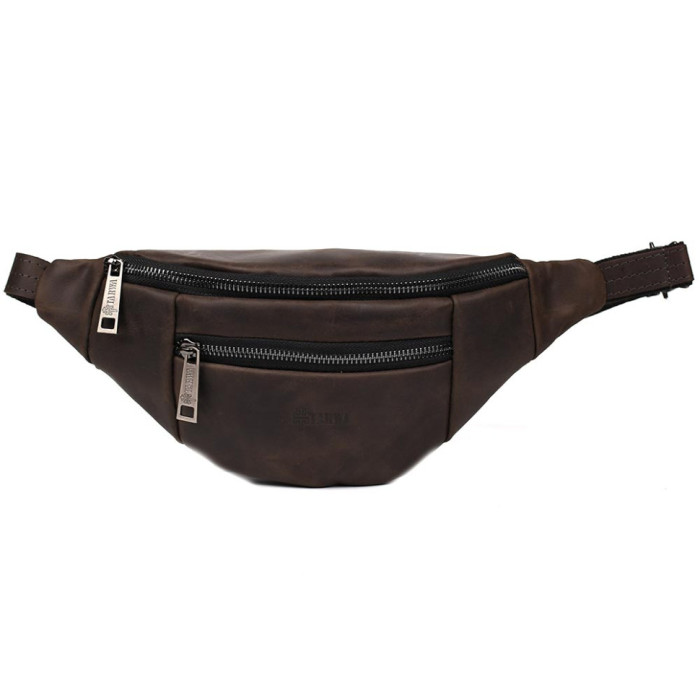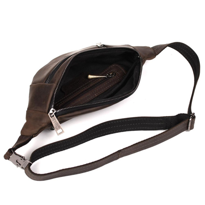 Кожаная бананка 8040 от TARWA пошита таким образом, что имеет два основных отделения: переднее объемное и заднее плоское для телефона или документов.