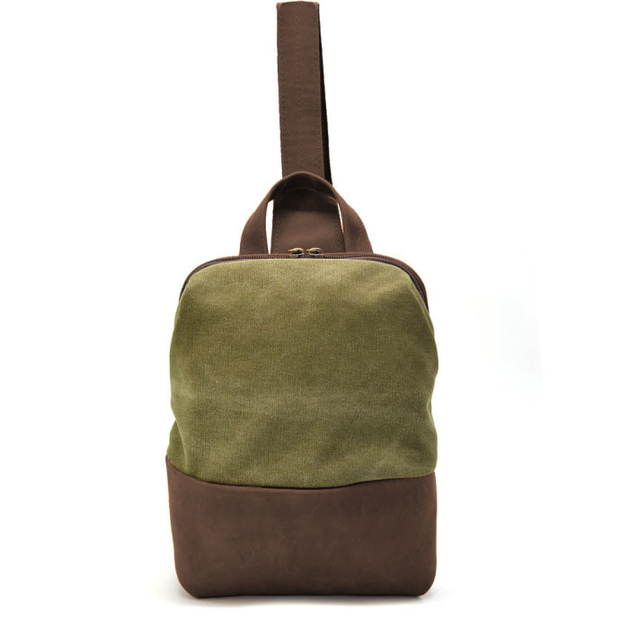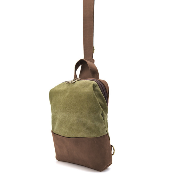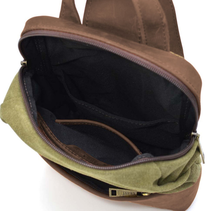 Рюкзак-слинг на одно плечо из кожи и канваса TARWA RBh-1905-3md- стильный и практичный аксессуар, идеально подходящий для повседневного использования. Комбинация высококачественной натуральной кожи Crazy Horse и текстиля в неярких и немарких цветах позволяет использовать модель в реальных боевых условиях. Кожа "Crazy Horse", из которой изготовлен аксессуар, обладает высокой прочностью, а текстиль легко чистится и не пачкает одежду.