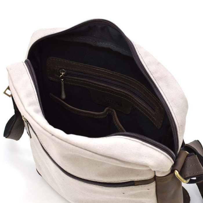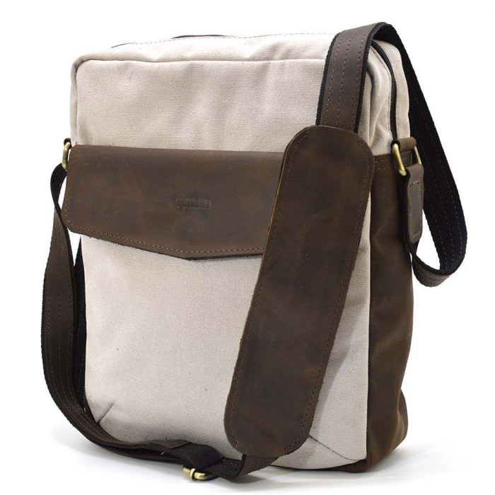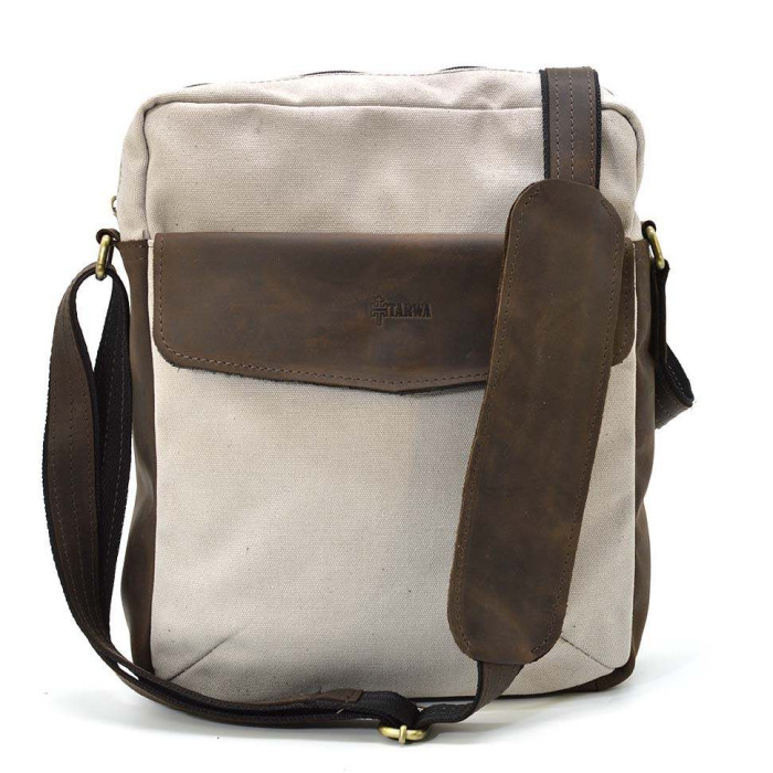 Мужская сумка из канвас через плечо TARWA RCJ-1810-3md слоновая кость от бренда Tarwa. Подходит для повседневной носки, для учебы и работы. Вмещает формат А4. Несъемный наплечный ремень с кожаным наплечником. Качественная молния и металлическая фурнитура.