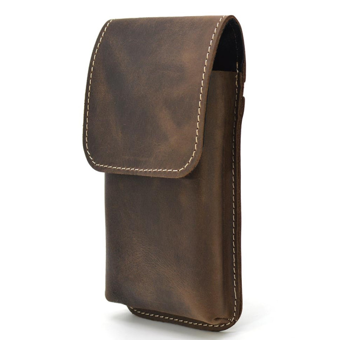 Кожаная сумка чехол на пояс или через плечо коричневая TARWA RCw-2093-3md, на ремень или небольшой мессенджер через плечо, из натуральной кожи крейзи хорс с клапаном на магните. Коричневая кожа. Носится путем надевания на пояс или с ремнем на плече или через плечо