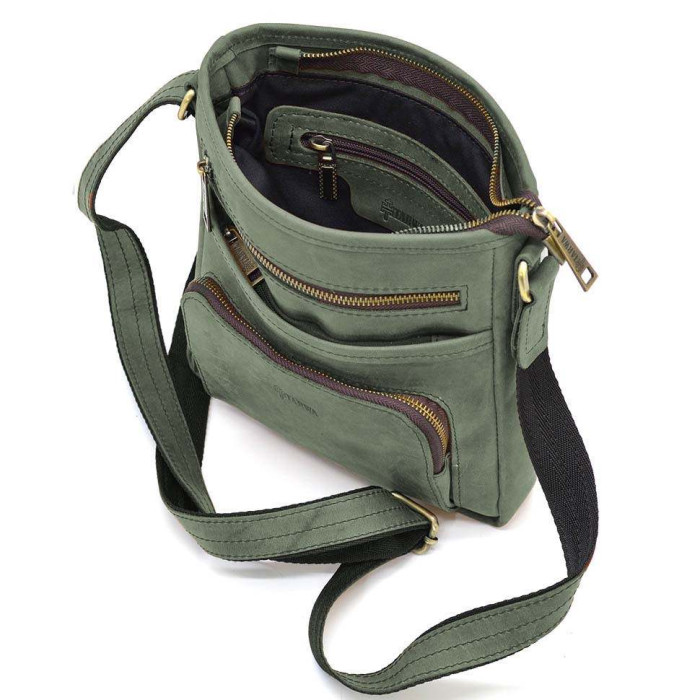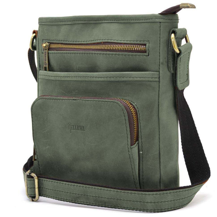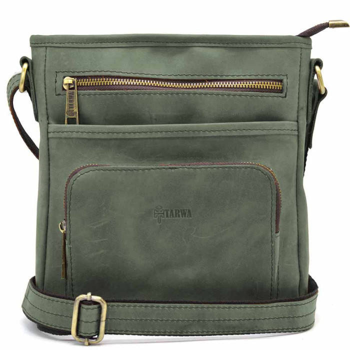 Мужская кожаная сумка с карманом RE-1303-3md TARWA зеленая из лошадиной кожи крейзи хорс от украинского бренда TARWA. Изделие на одно отделение, которое застегивается на молнию. Может вмещать планшет. Внутри имеются карманы для мелких личных вещей: два открытых накладных и один врезной на молнии. На обоих наружных сторонах аксессуара располагаются врезные карманы на молнии. В изделии использован прочная тканевая подкладка. Сумочку можно носить на плече благодаря удобному регулирующемуся плечевому кожаному ремню. Молния - антик