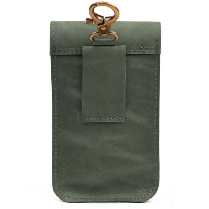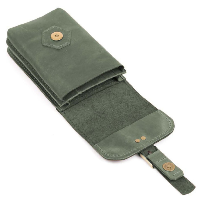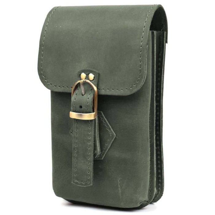Кожаная сумка чехол на пояс на ремень, из натуральной кожи крейзи хорс с клапаном на застежке. Зеленая лошадиная кожа. Носится путем надевания на пояс или карабином к петле брюк, на лямку рюкзака.