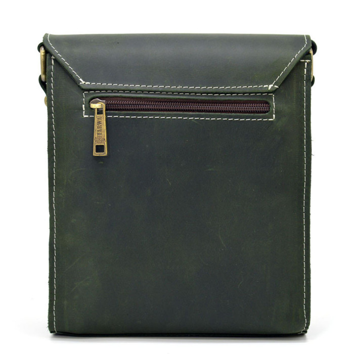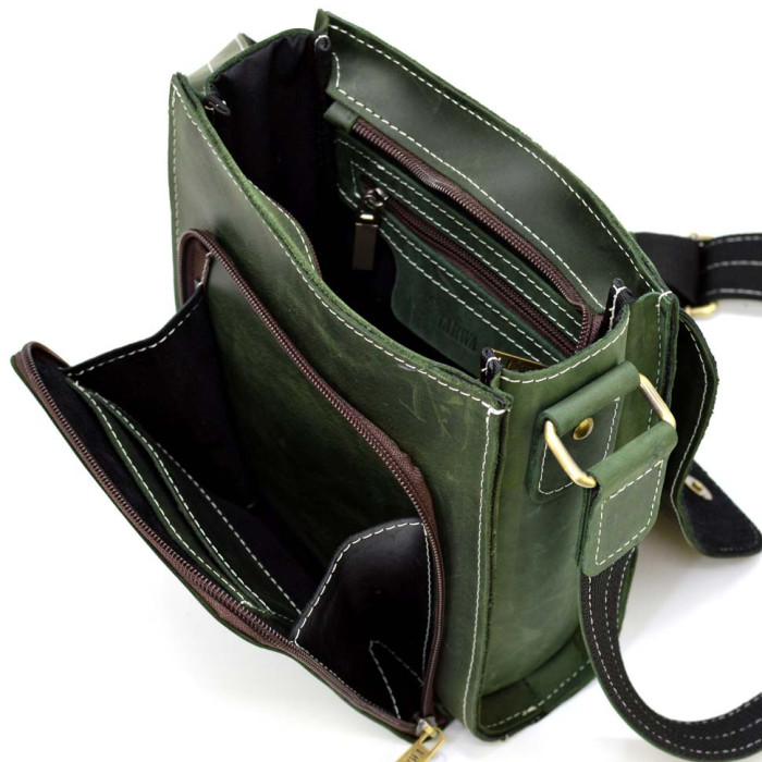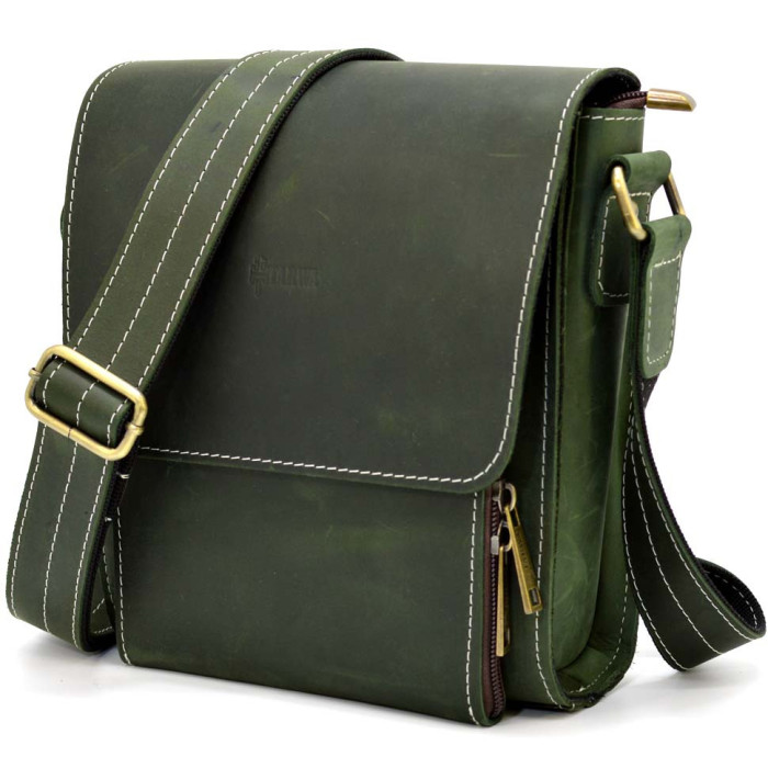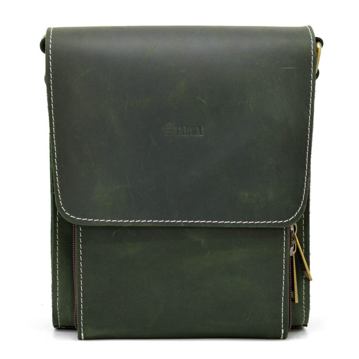 Удобная мужская сумка-планшет через плечо RE-3027-3md бренда TARWA, из натуральной телячьей кожи зеленого цвета с белой строчкой. Изделие состоит из одного отделения, внутри которого имеется карман на молнии для личных документов и еще один накладной открытый карман для телефона, например. Сумка застегивается на молнию и сверху накрывается клапаном с магнитной кнопкой. На клапане присутствует гравировка с логотипом производителя. Под клапаном располагается практичный, откидной, вместительный карман на молнии с внутренними кожаными отсеками, для пластиковых карт. На задней стороне изделия находится еще один карман на молнии. Сумка наделена кожаным, регулируемым ремнем.