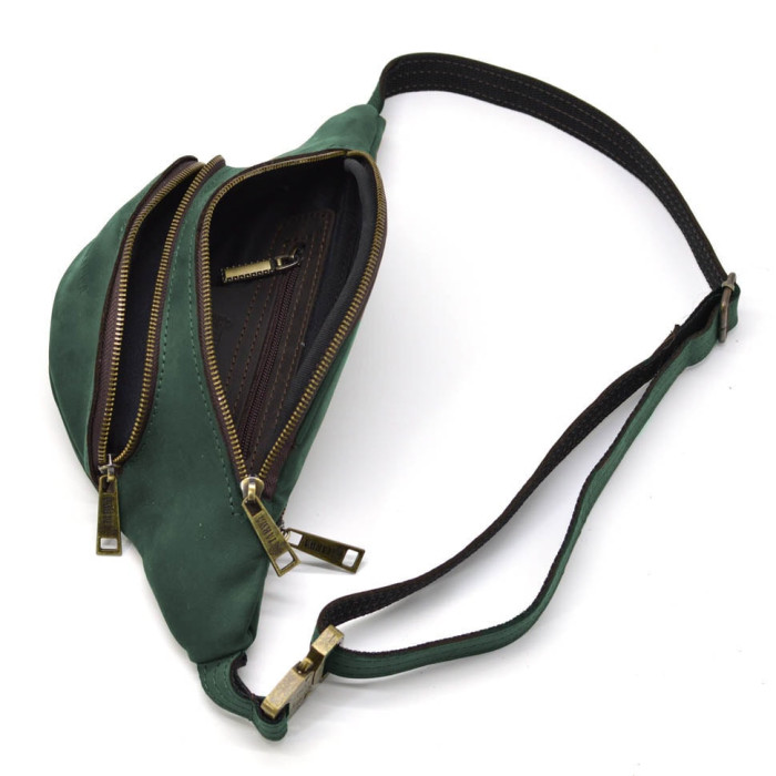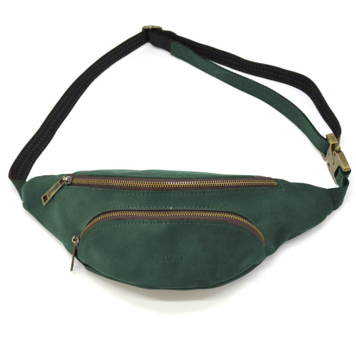 Поясная сумка бананка кожаная зеленая RE-30351-3md TARWA. Модель предназначена для прогулки, поездки или путешествия - и все необходимые вещи всегда под рукой. Имеет два больших отдела на молниях, передний накладной карман на молнии. Кожаный ремень с регулировкой длинны и тактический быстросъемный фастекс Кобра в цвете антик.