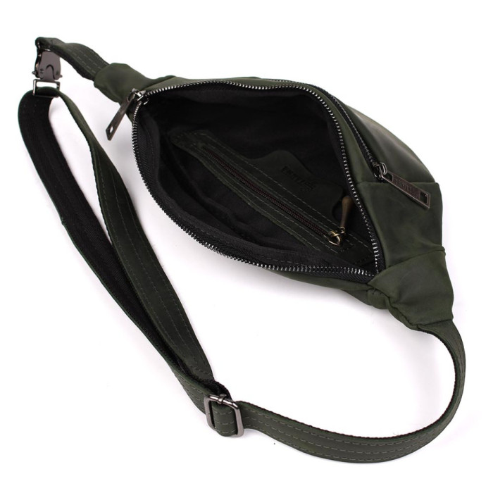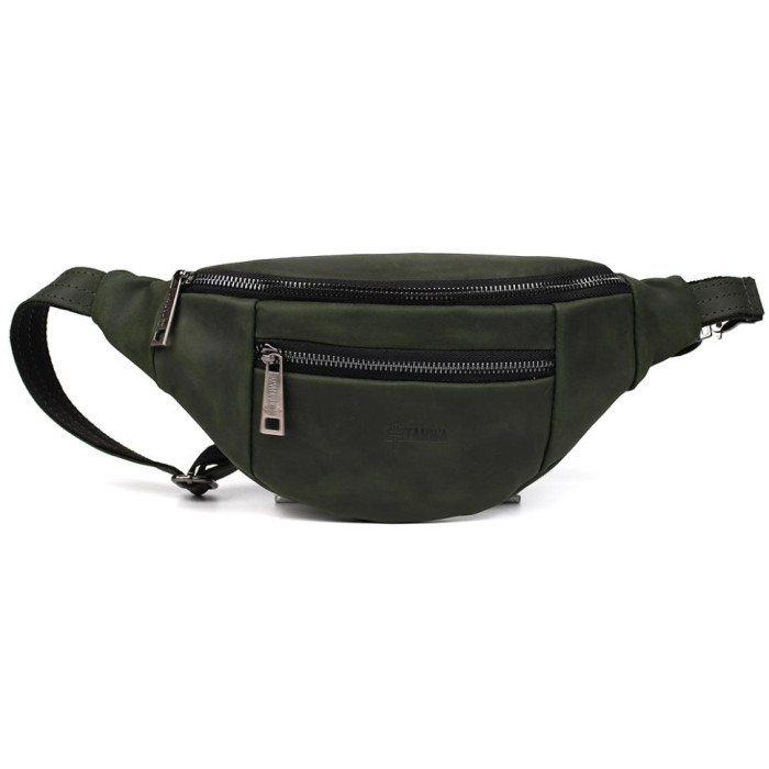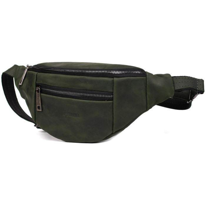 Кожаная бананка 8040 от TARWA пошита таким образом, что имеет два основных отделения: переднее объемное и заднее плоское для телефона или документов.