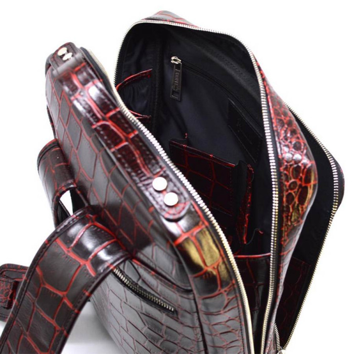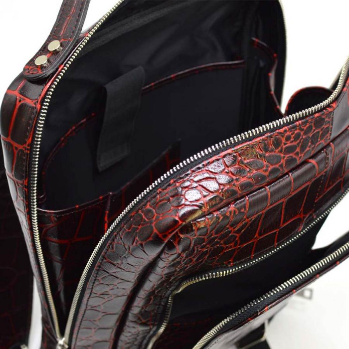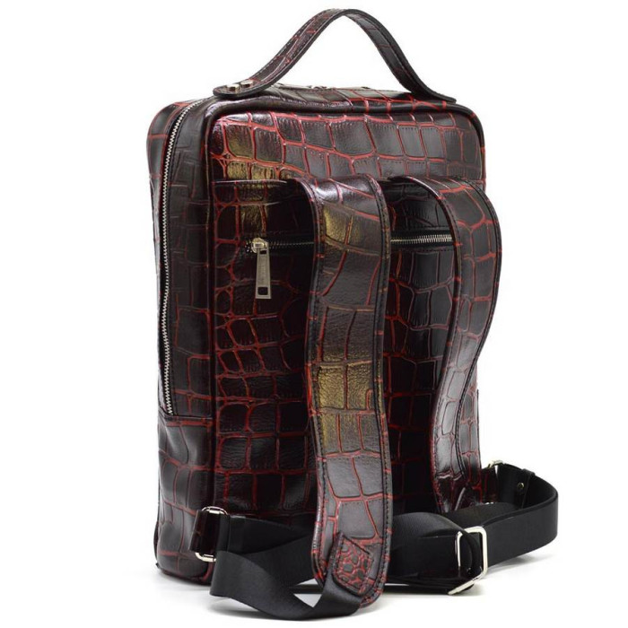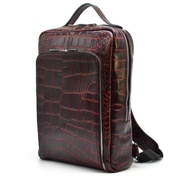 Кожаный рюкзак для ноутбука под рептилию REP1-1239-4lx TARWA, от украинского бренда TARWA. Идеальный вариант для работы и учебы. Удобная и практичная модель, подойдет как для мужчин, так и для девушек. Изделие имеет одно основное отделение, внутри которого располагается карман-отсек для ноутбука или макбука диагональю до 14", фиксируется сверху липучкой, большой врезной карман на молнии и два маленьких кармана для смартфона и портмоне.