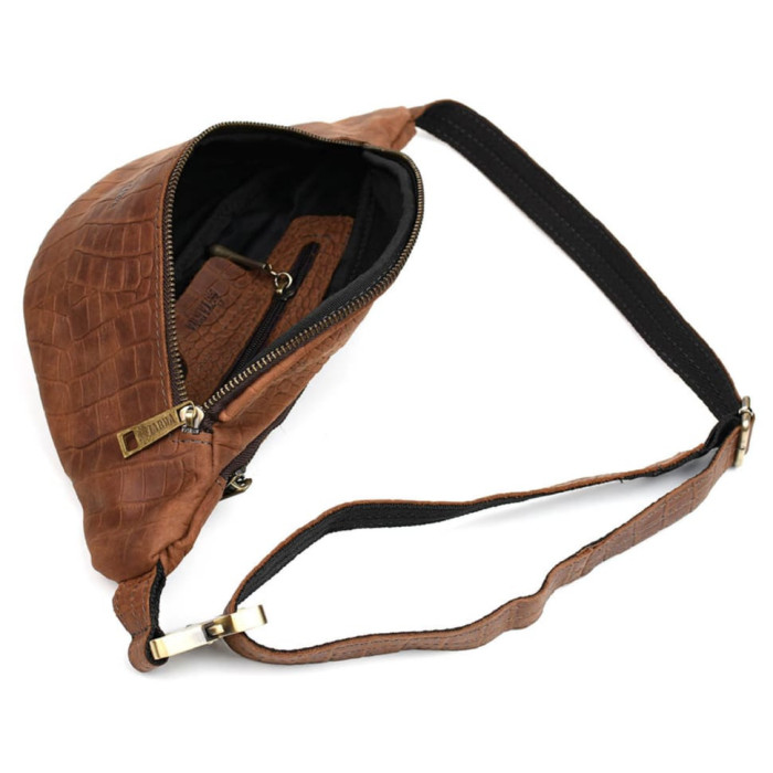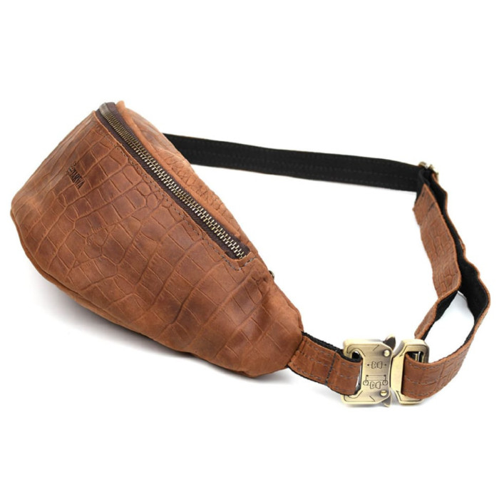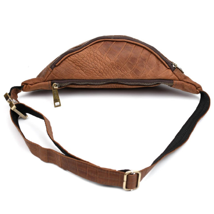 Напоясная сумка из натуральной кожи насыщенного светло-коричневого цвета REPC-3035-3md с тиснением под рептилию, бренда TARWA. Удобный аксессуар для прогулки, поездки или путешествия - и все необходимые вещи под рукой. Смартфон, небольшое портмоне, паспорт, права, ключи - все это Вы с легкостью сможете разместить в напоясной сумке REPC-3035-3md TARWA. Сумка на пояс на два отделения, с врезным карманом внутри одного из них, бОльшего по размеру. Напоясный ремень выполнен из кожи, с тканевой основой, защищающей ремень от растягивания. Внутри подкладка из износостойкого текстиля. Для изготовления сумки использовалась надежная металлическая фурнитура: тактический фастекс (застежка), наружные молнии. На лицевой части присутствует логотип бренда.