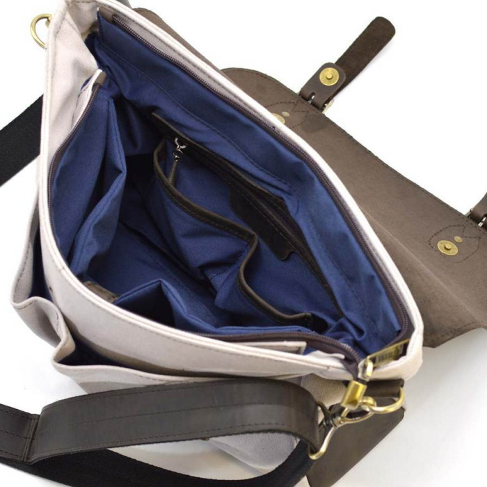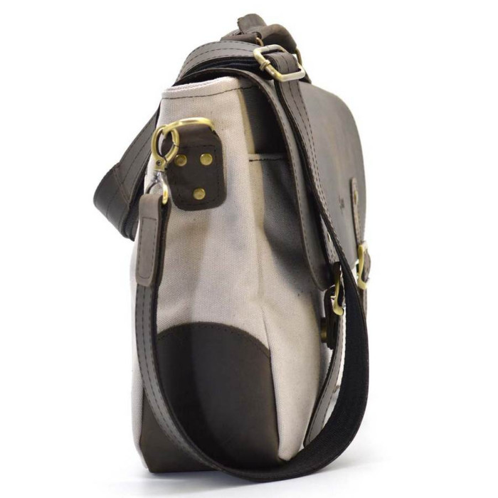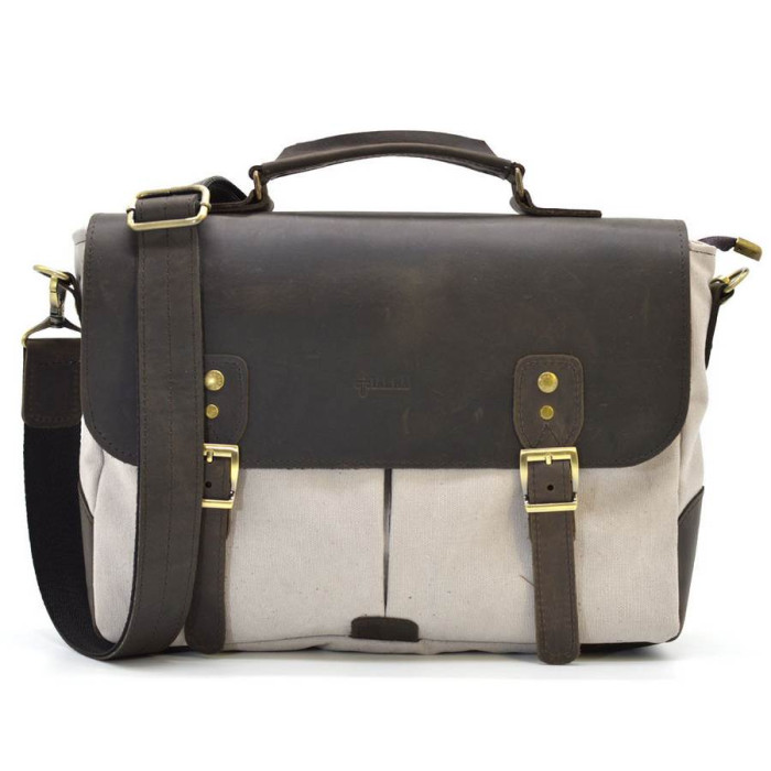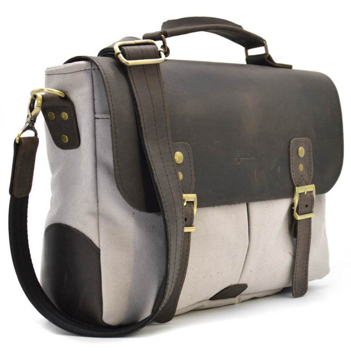 Мужская сумка-портфель из канвас и кожи RGj-3960-3md TARWA, от украинского бренда TARWA. Изделие выполнено из очень плотной ткани с элементами кожаных вставок и кожаным клапаном, с маленькой кожаной ручкой сверху и ремнем через плечо. Внутри изделие обшито тканевым подкладом. Портфель на одно отделение, с внутренним мягким отсеком на липучке для ноутбука (до 14"). Также, внутри есть большой врезной карман, застегивающийся на молнию, и два накладных кармана поменьше для телефона и портмоне. На лицевой стороне есть два открытых кармана, которые прикрывает кожаный клапан с фальш-ремешками и магнитными кнопками. На задней стороне сумки располагается большой плоский карман с молнией. Аксессуар оснащен съемным текстильным ремнем через плечо, на котором в местах крепления присутствуют кожаные вставки.